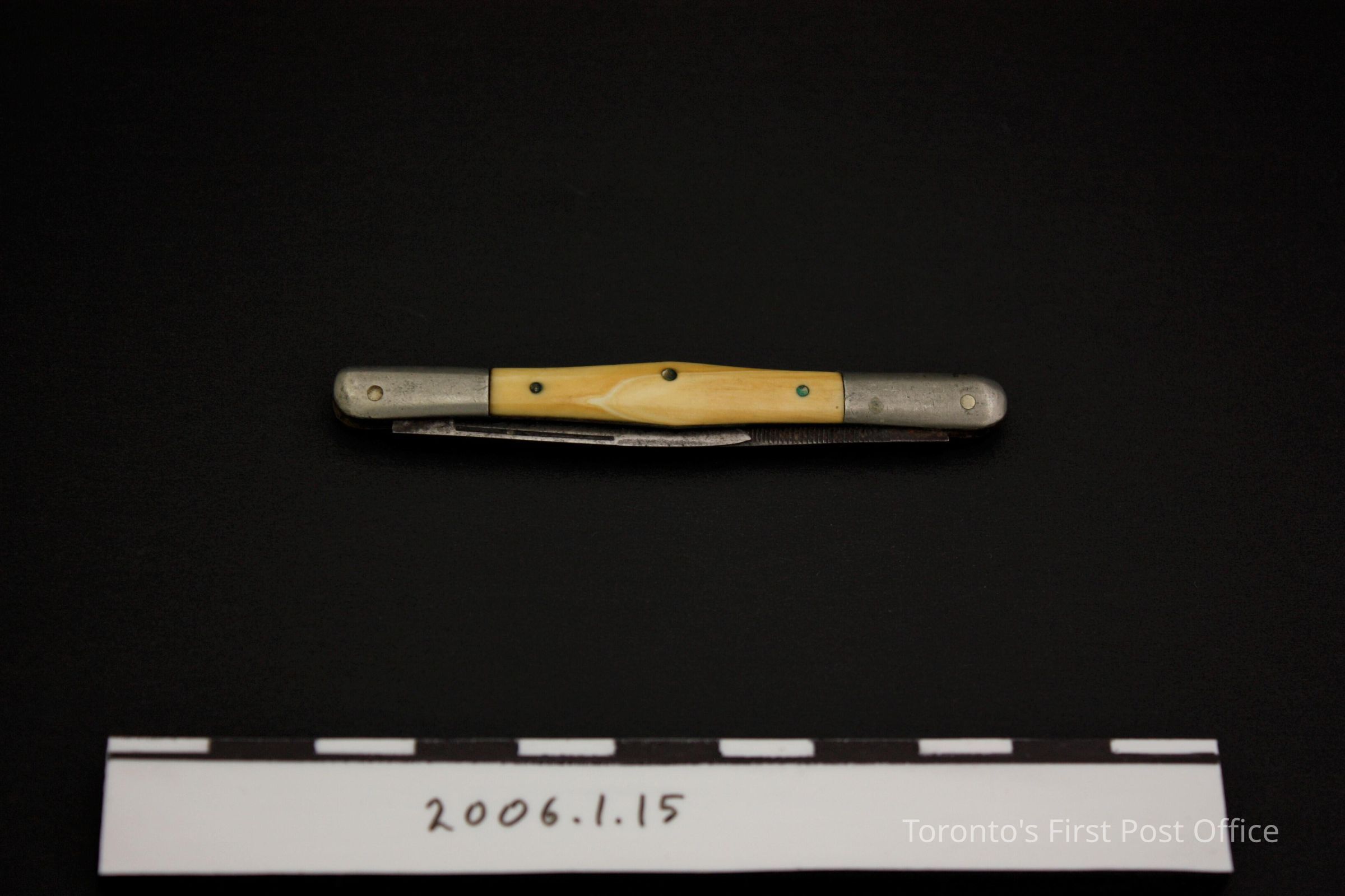 Pen knife with bone and metal (tin?) sides; two steel blades; 2/3 of one blade is a file with sharpened blade at tip; five pins on each side; marked "COOK BROS SHEFFIELD" on each blade; circa 1875-1890.Dimensions