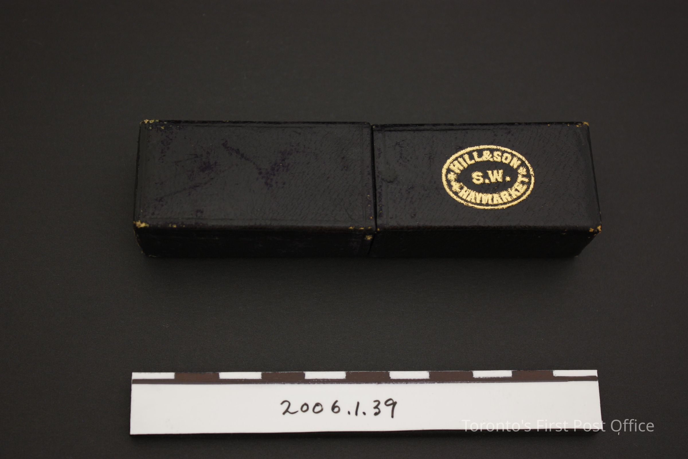 .2: Case with separate lid; cardboard covered with maroon leather on outside; blue fabric under lid; red, white, and blue interior; stamped with "HILL & SON 4 HAYMARKET S.W." in gold on lid; circa 1830.Dimensions