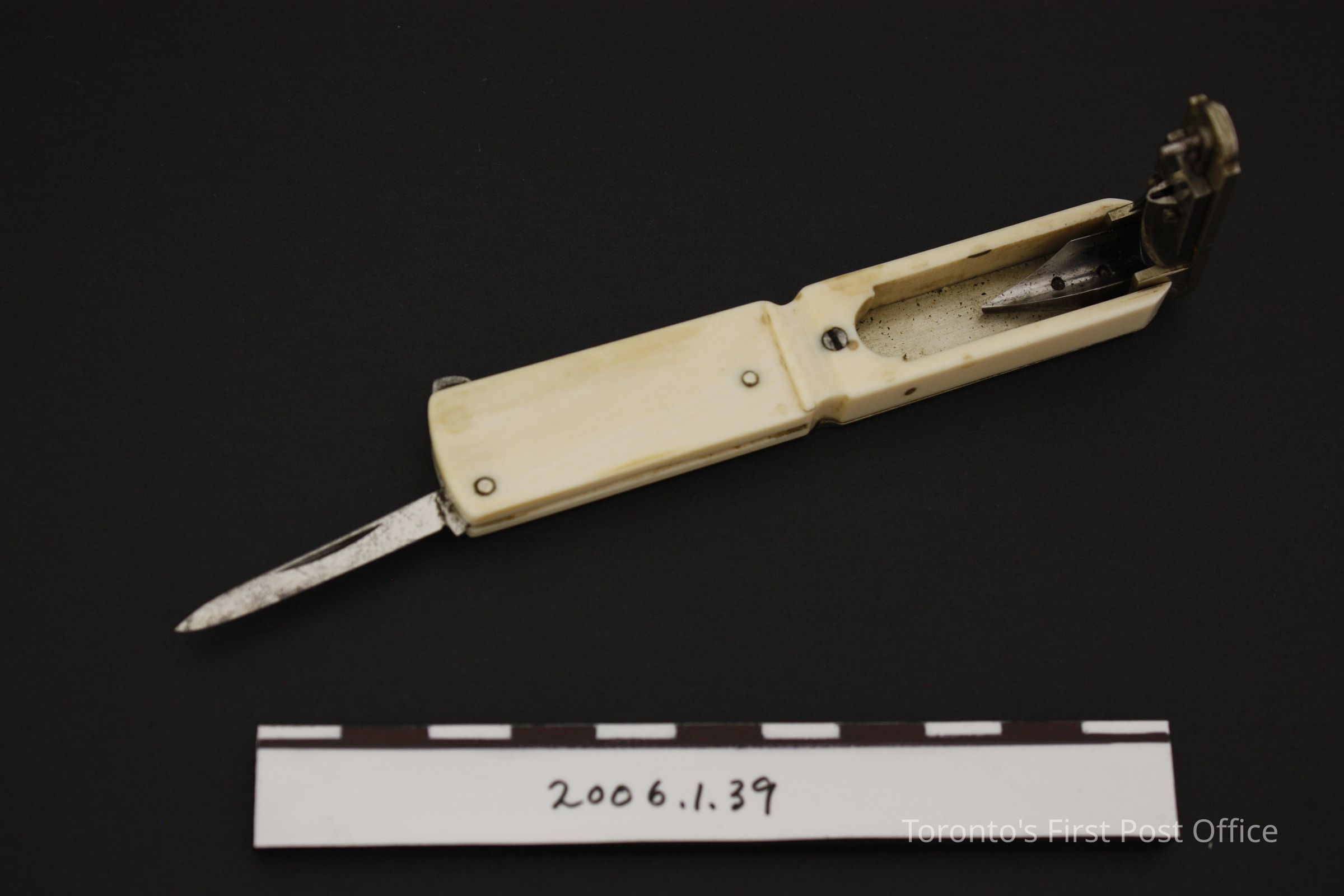 .1: Quill cutter with ivory sides; silver and steel cutter; fold out steel blade; silver stamped "LONDON" on one side and "PATENT" on other; seven pins; five screws