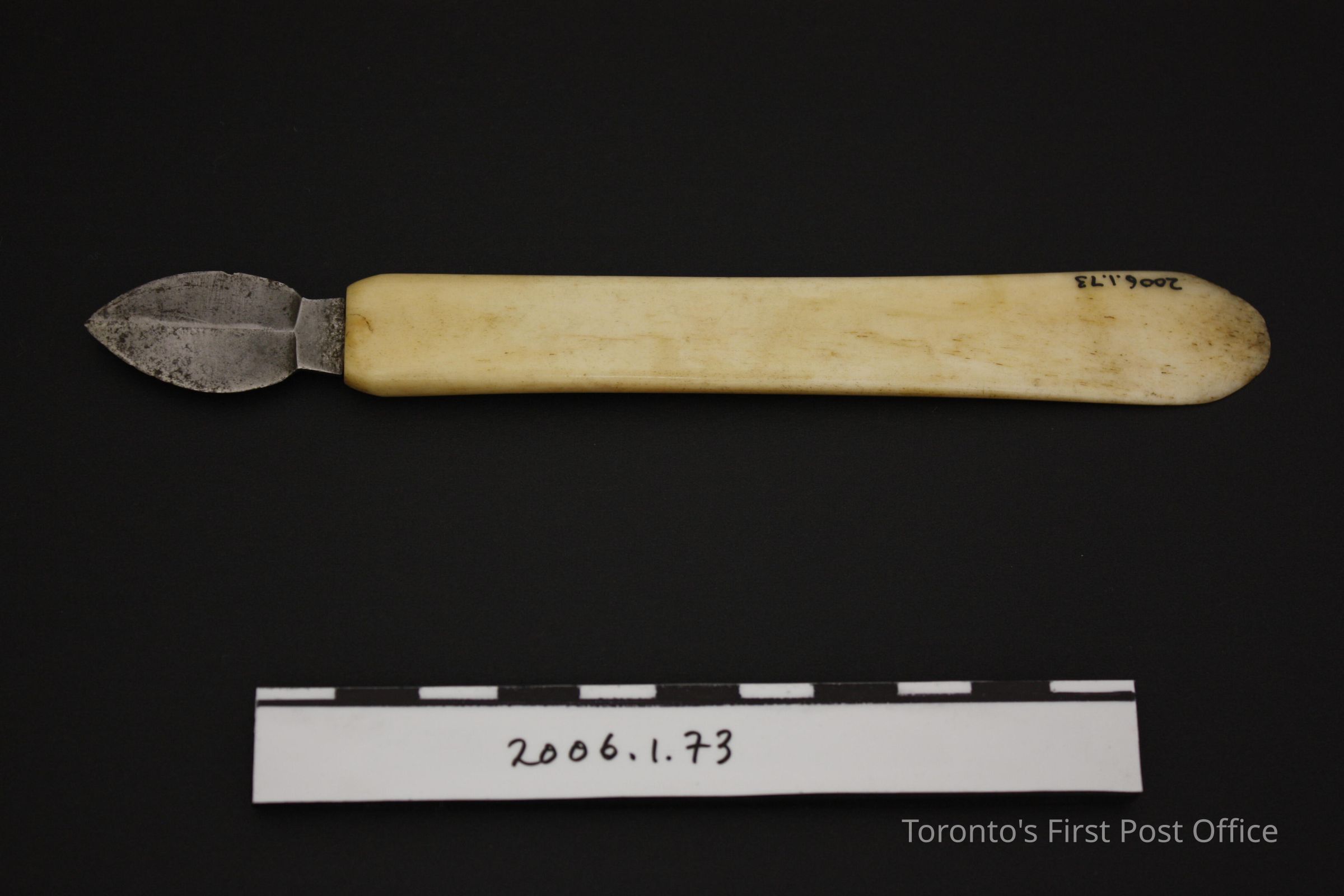 Eraser knife with double-edged arrowhead-shaped steel blade in bone handle; blade marked with "GEORGE WOSTENHOLM IXL CUTLERY SHEFFIELD"; shield stamped on handle with "CIVIL SERVICE/CANADA"; circa 1870.Dimensions
