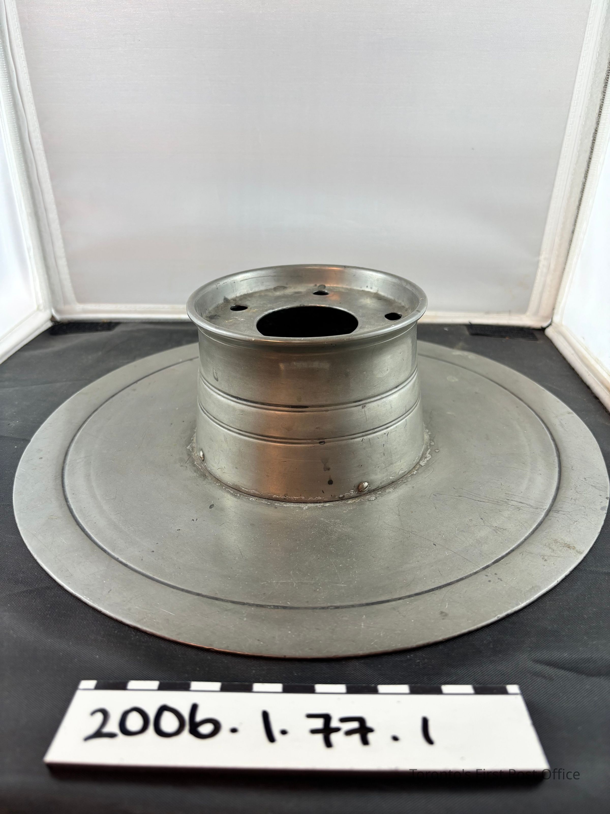 Pewter inkwell with wide flat skirt around central inkwell; five quill holes in inkwell; design is one plain line approx. 3 cm from outer circumference in skirt and two double lines around inkwell; plain glass insert sits on wooden base in well; circa 1830-1860.Dimensions