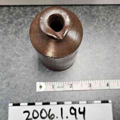 Ink bottle with pouring lip; pottery; stamped "LOVATT & LOVATT LANGLEY MILL NOTTS."; dark brown glaze.Dimensions