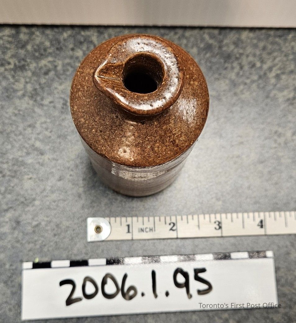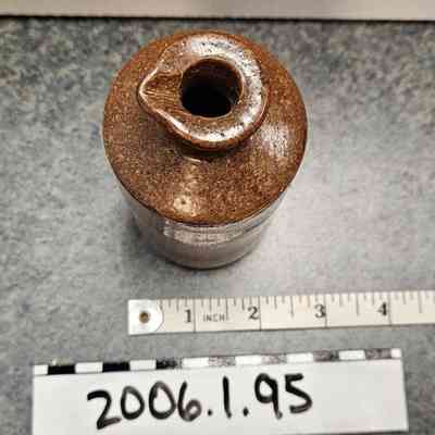 Ink bottle with pouring lip; pottery; stamped "LOVATT & LOVATT, LTD.."; light brown glaze.Dimensions
