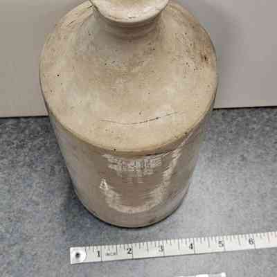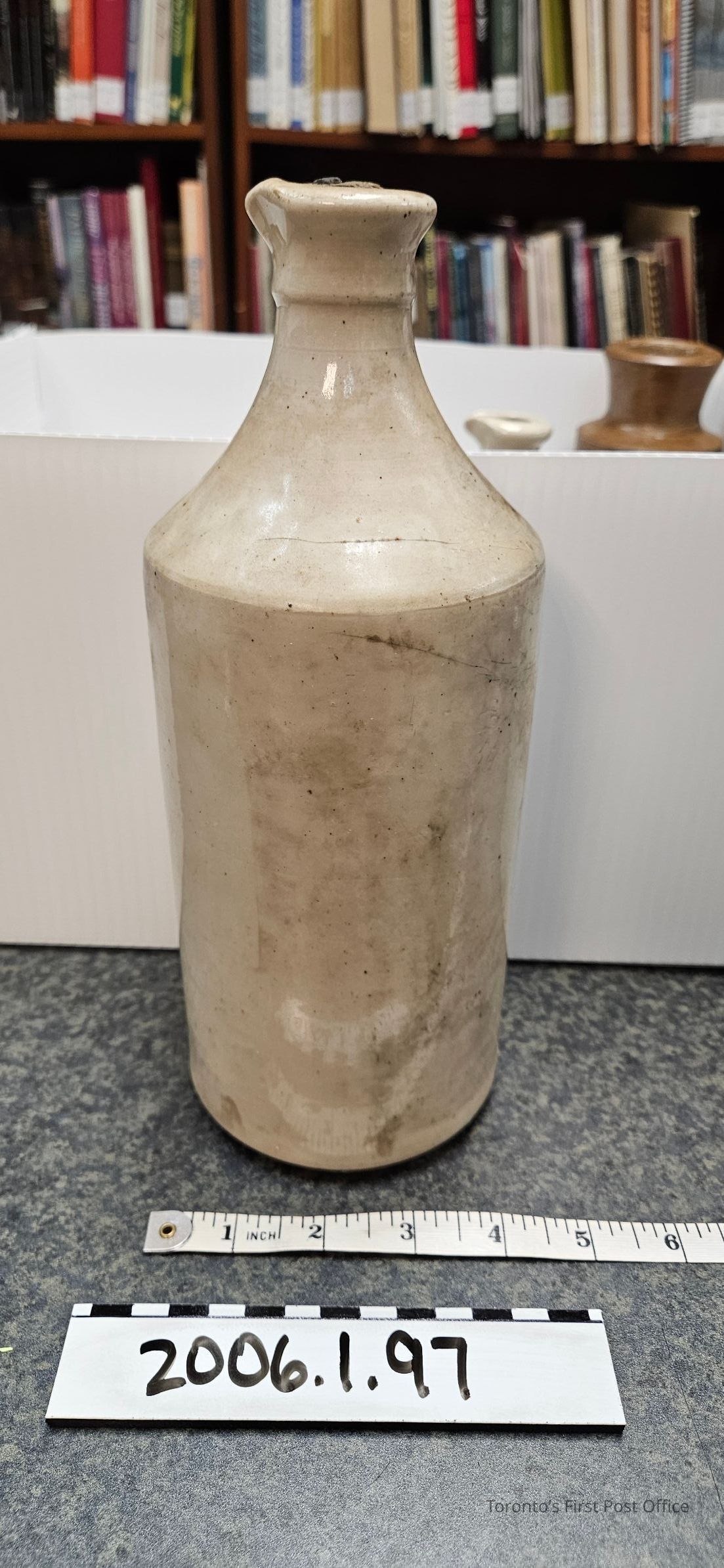 Ink bottle with pouring spout; pottery with white glaze; corked; stamped "… VANCROFT GLASGOW 5" and "40".Dimensions