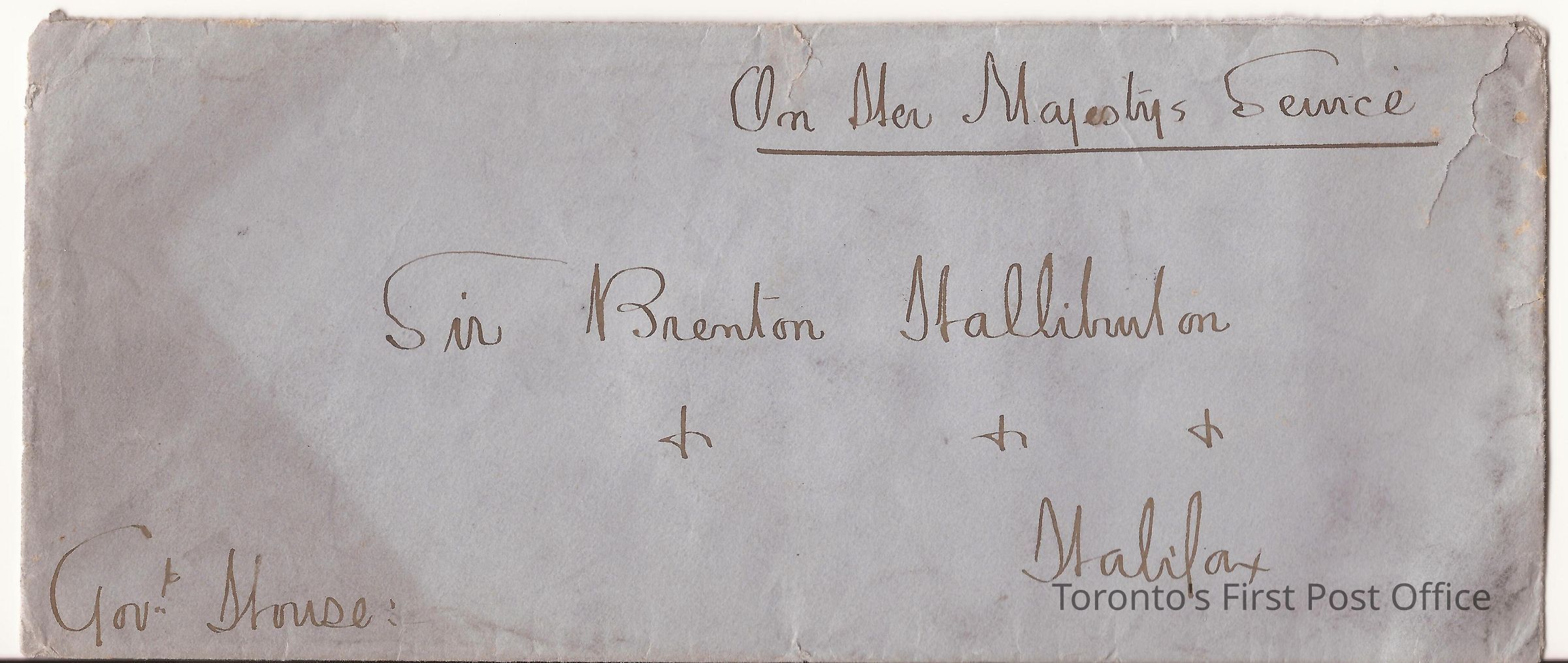 Blue envelope addressed to "Sir Brenton Halliburton Halifax" also "Govt House", "On Her Majesty's Service"; all in brown manuscript; no postal marks; seal impression is of Province of Nova Scotia in red wax; circa 1855.Update Date