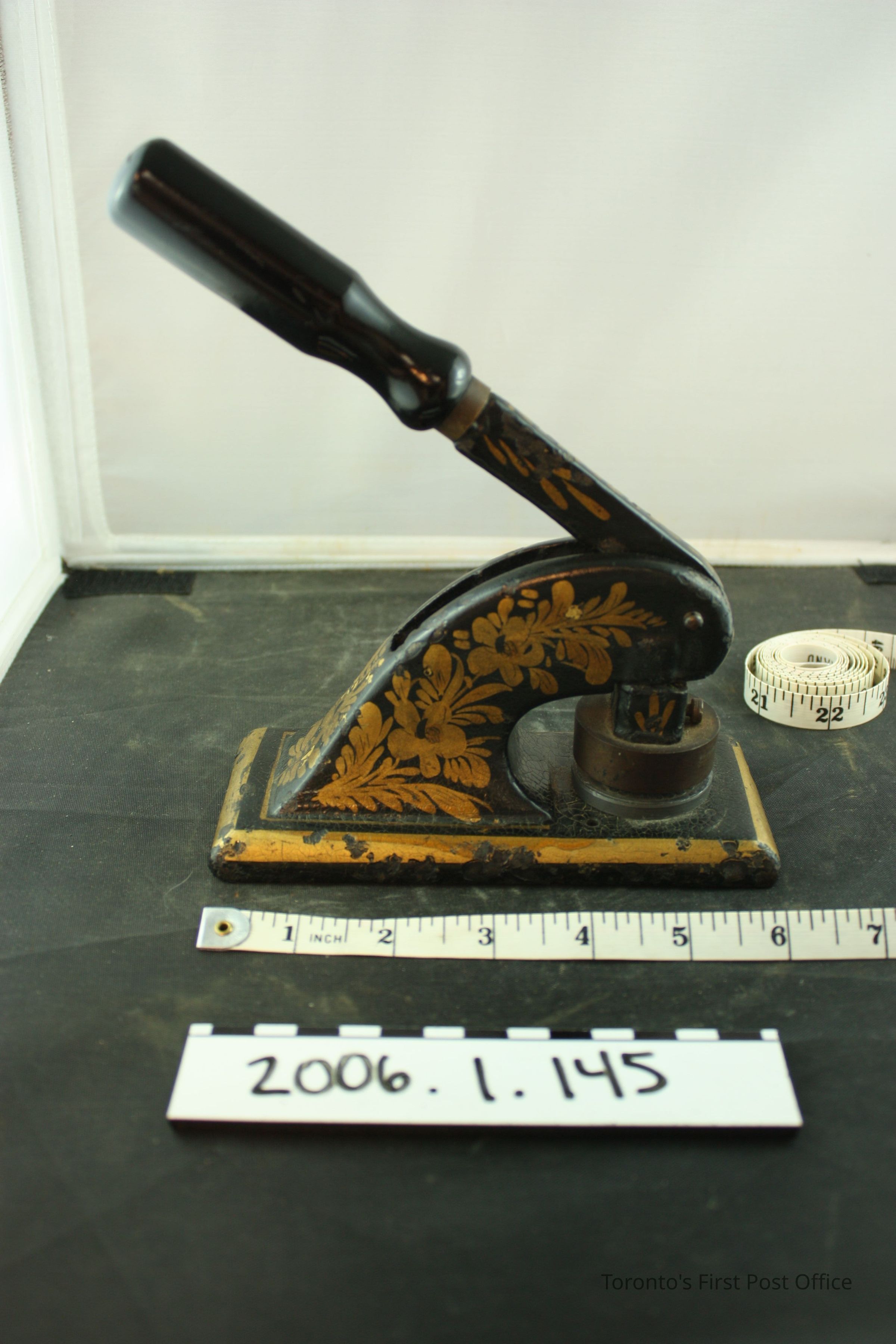 Embosser with black cast iron body and arm; black wooden handle with brass collar; hand painted with gold floral arrangement and trim; round seal with faint impression containing word "TRANSPORT"; circa 1885.Dimensions
