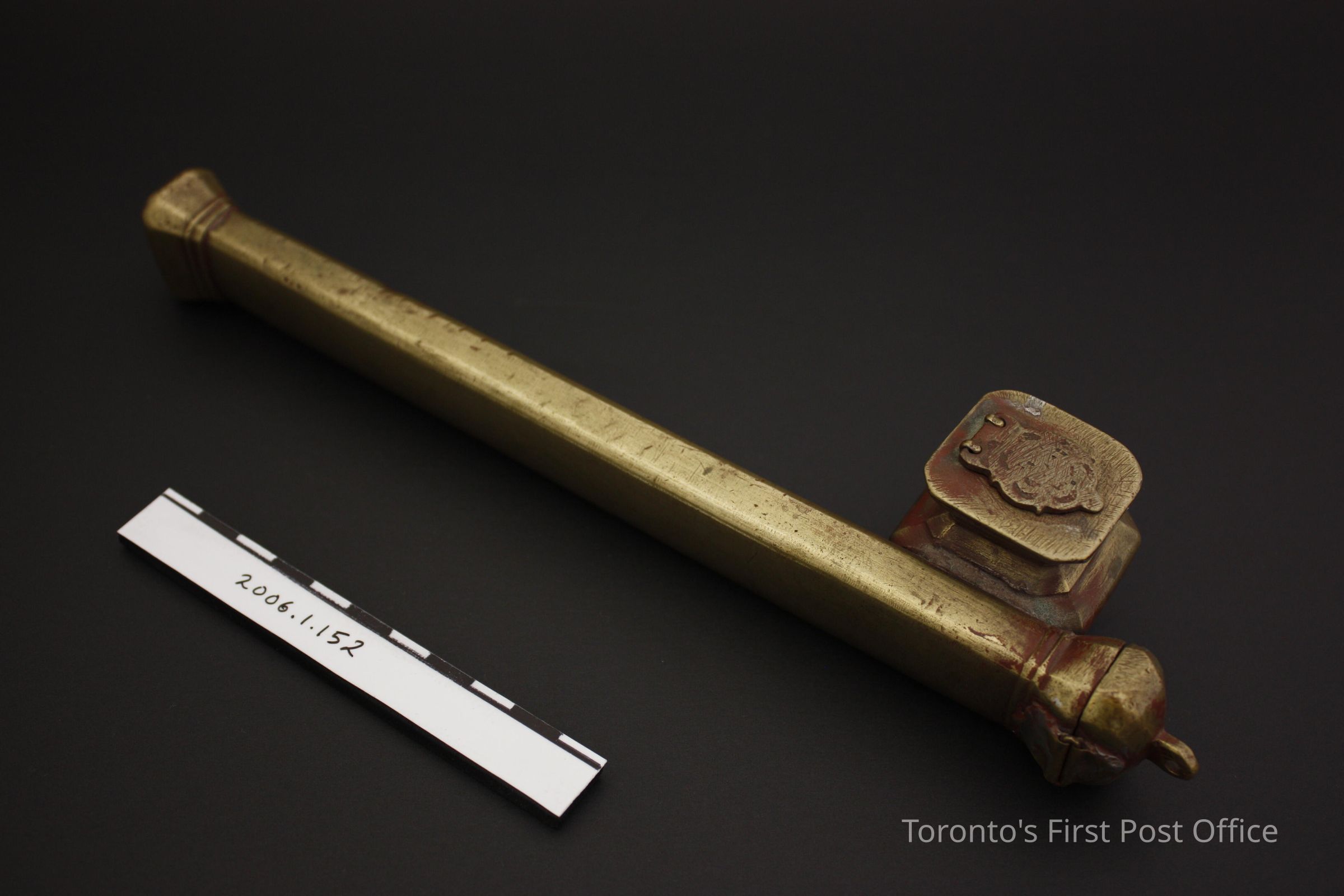Travelling inkwell and pen case; brass; each section has hinged top; design on top of ink case; circa 1850.