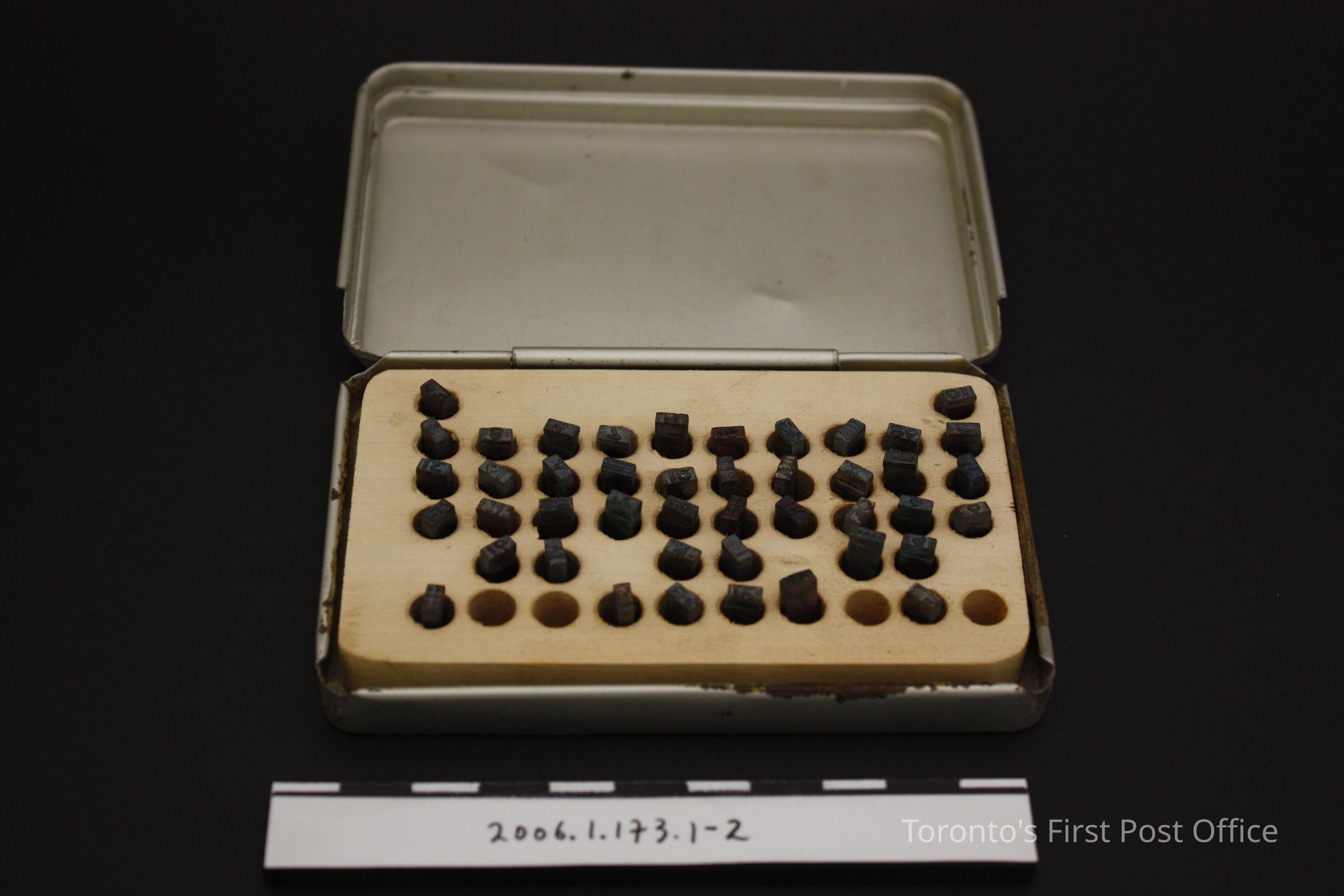 .1: Cancellation hammer with wooden handle; steel arm; screw-on steel marker: "YORK-TORONTO-1833 CANADA POST POSTES CANADA PM 15 XII 83"; circular marker; .2.1: tin box with hinged lid; contains: .2.2: unfinished wooden holder with forty-eight holes to hold type; and 3.1-44: steel type; roman numerals, "AM", and numbers for .1; circa 1984.Dimensions