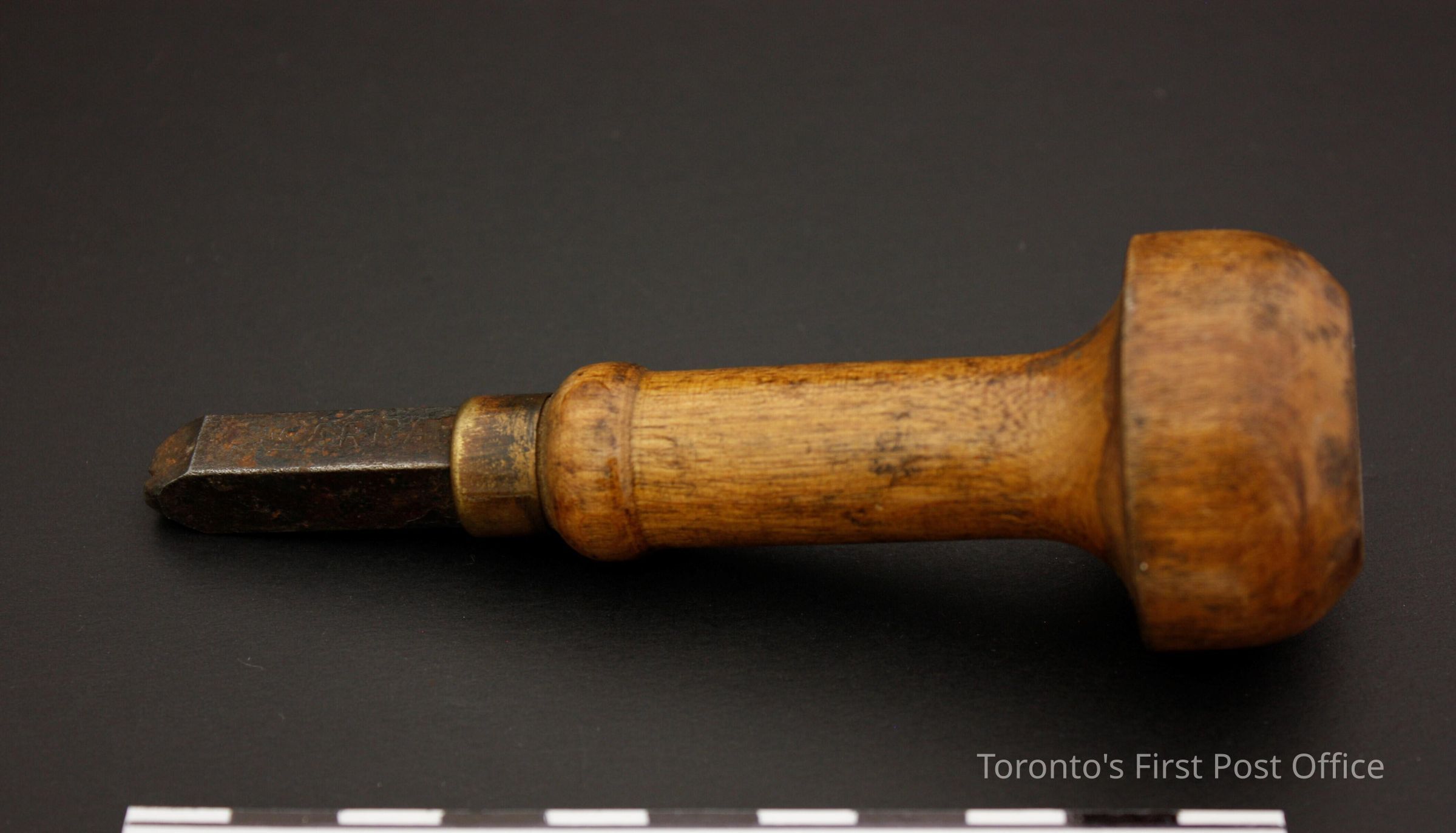 Four hand stamps; all with wooden handles; brass collars; steel markers; each has marker number on top of handle; stamp impressions as follows: .1: "1 1/8"; .2: "5"; also marked "WARRA…" on side of marker; .3: "5 1/2" with red line of paint on handle; .4: "5 1/2".Dimensions