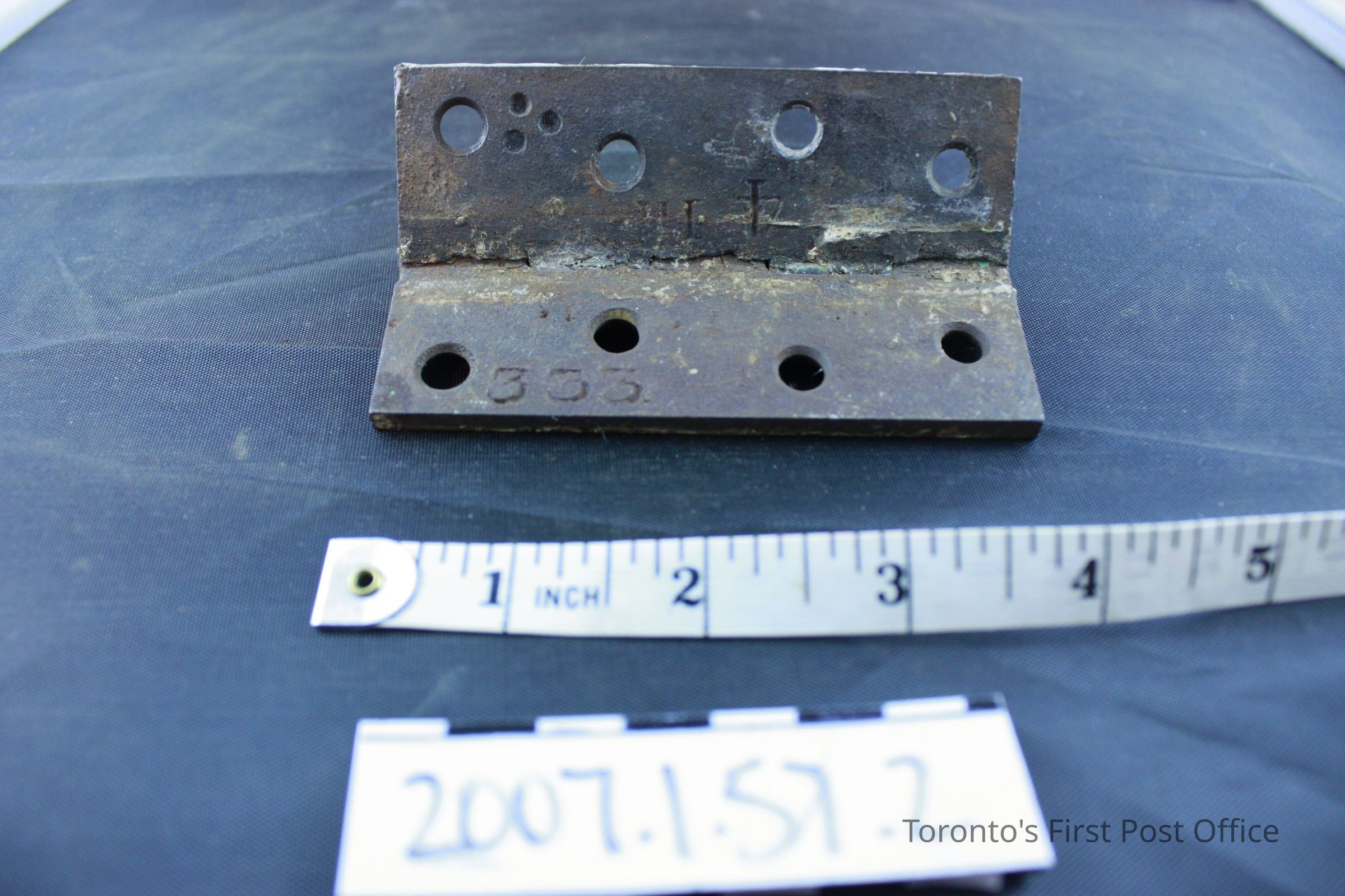 Three iron hinges; five part hinge; four screw holes in each side; each marked "333" and "4 in" and three dots in triangle pattern on back; each coated with grey-green paint with drips of red-brown paint; from the Bank of Upper Canada Building at Duke and George, 1827; removed 1981.Dimensions