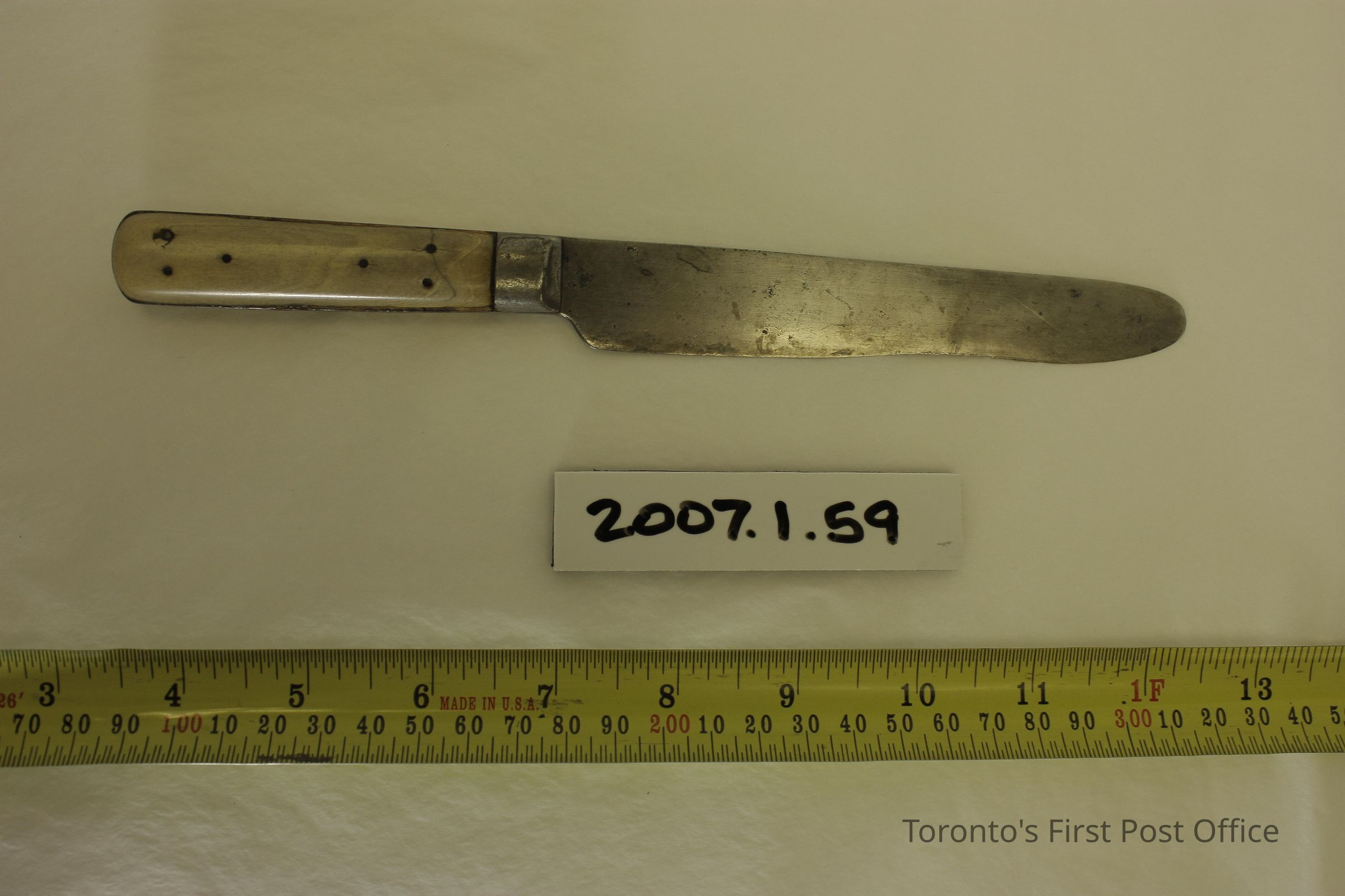 One dinner knife with steel blade with rounded tip; bone handle with six pins on each side; one large bone or wooden pin in one side of handle; possibly Ridout family possession; dug up from South wall (front) of Bank of Upper Canada Building by Sheldon Godfrey Sept. 1981.Update Date