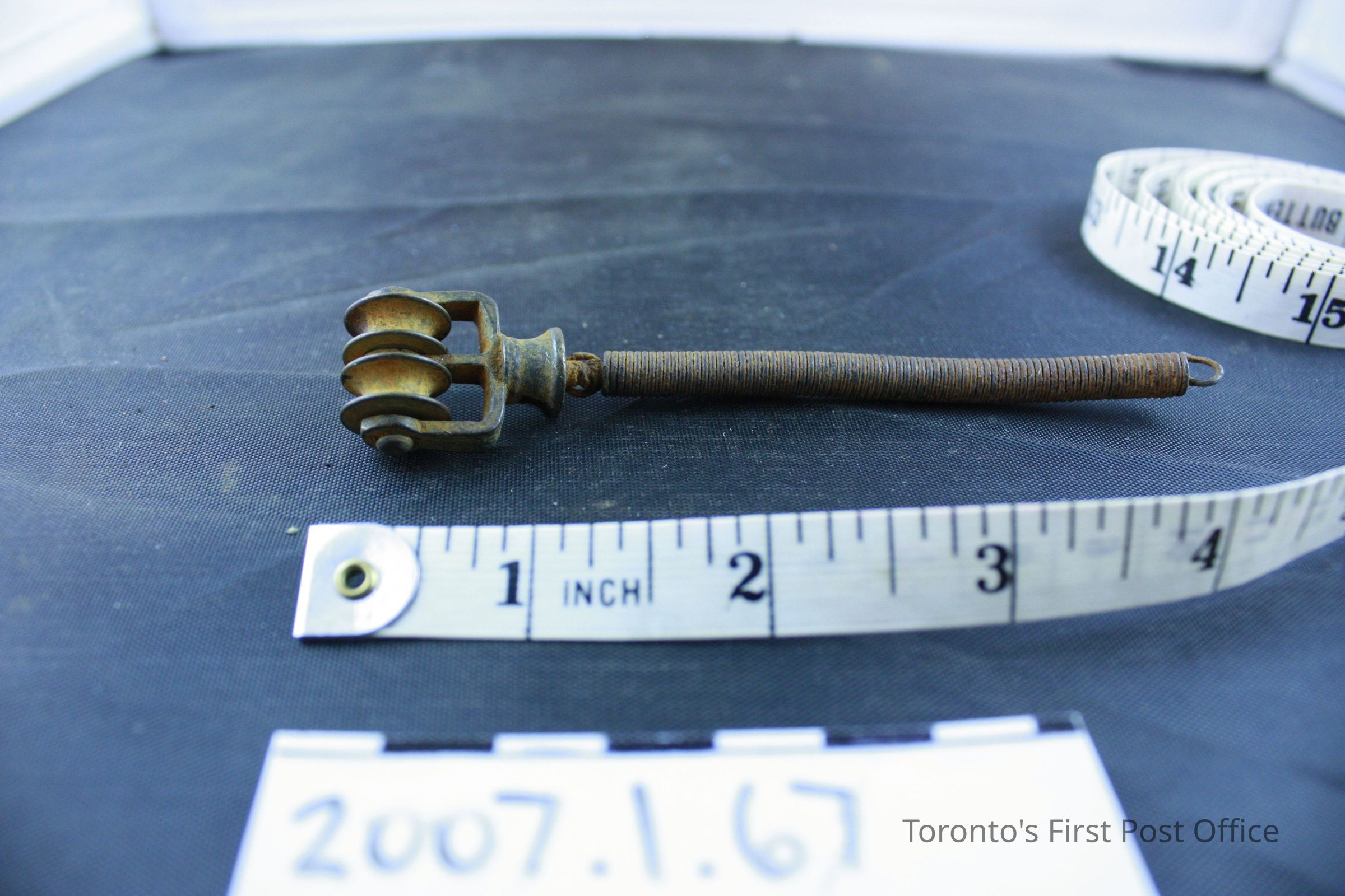 One metal remnant; tight spring with loop at end; head on other end has pin with two rollers for cord or chain (possibly for curtains?); removed from Bank of Upper Canada Building during renovations; c. 19th C.Dimensions