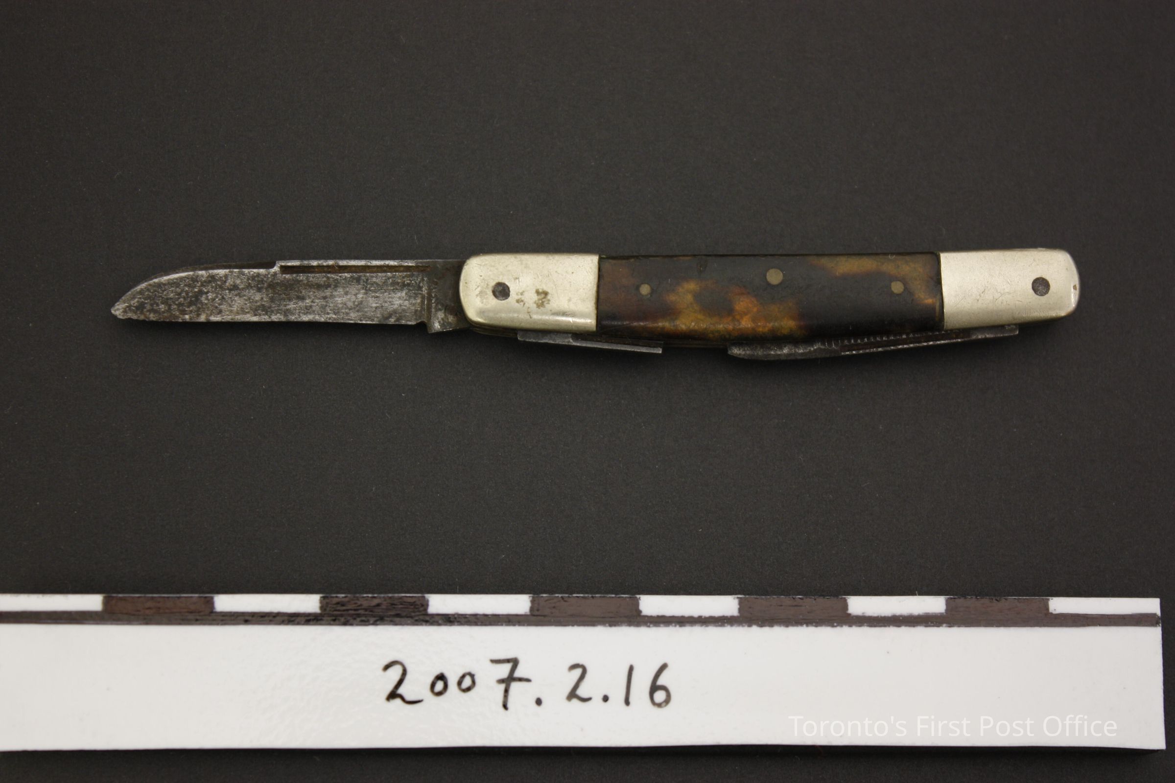 Pen knife with tortoise-shell sides; nickel-silver caps; two steel blades at one end; file and blade base at other end; blades marked "KNICKERBOCKER"; five pins; c. 1900.Dimensions
