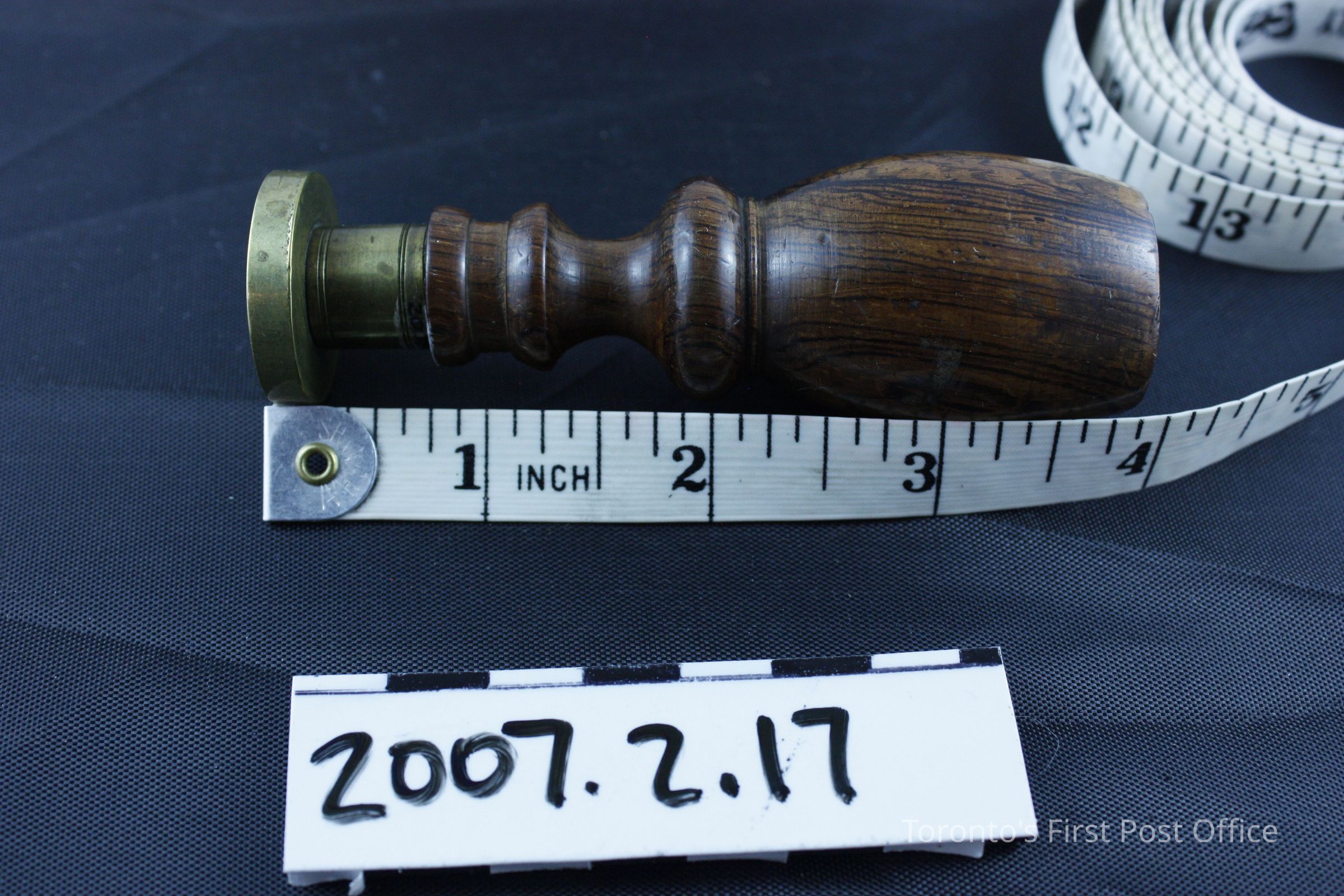 Seal with rosewood handle with 1.5 Ø hollow space at end; brass seal imprints a victorian crown and "CREEK.BANK U.C"; a municipal seal; c. 1852.Dimensions