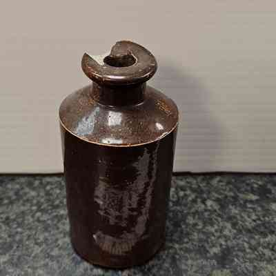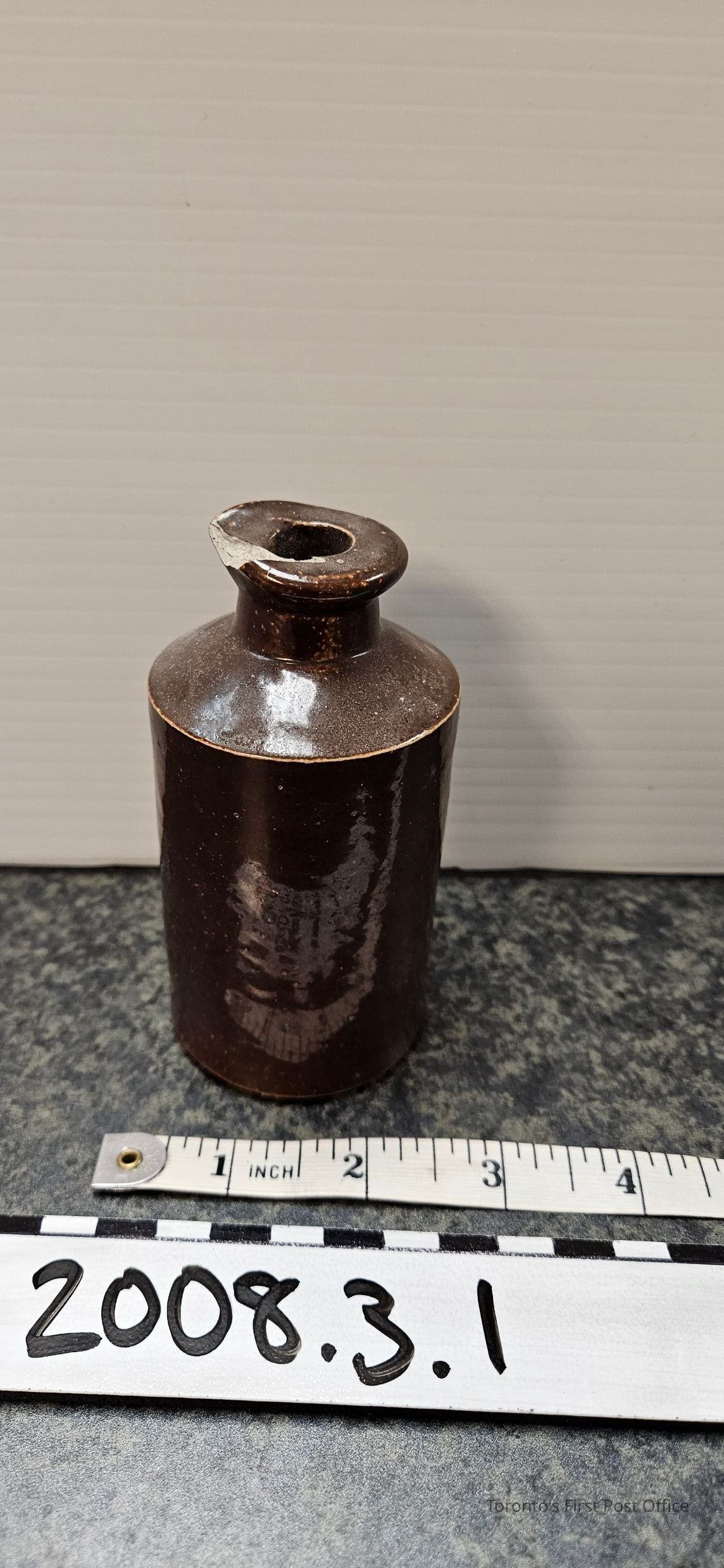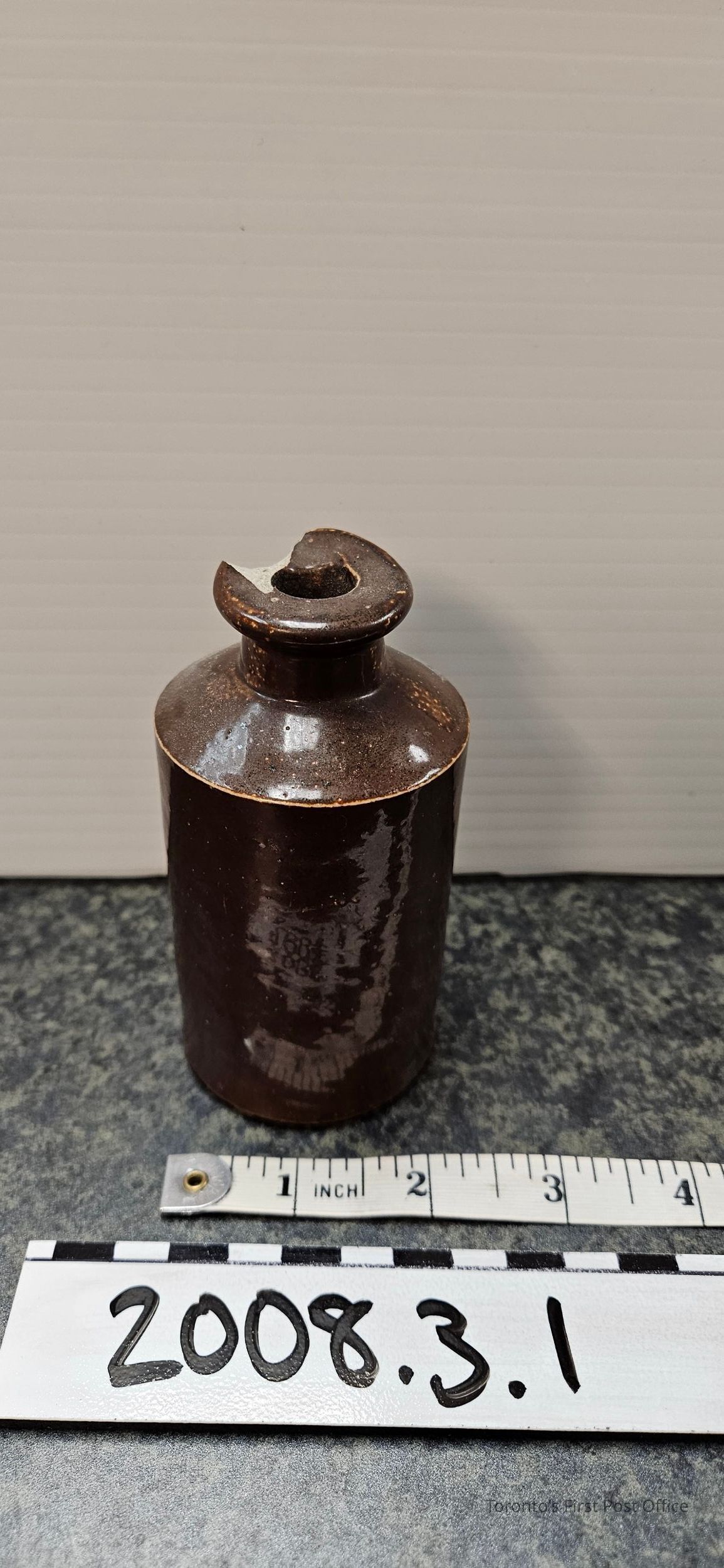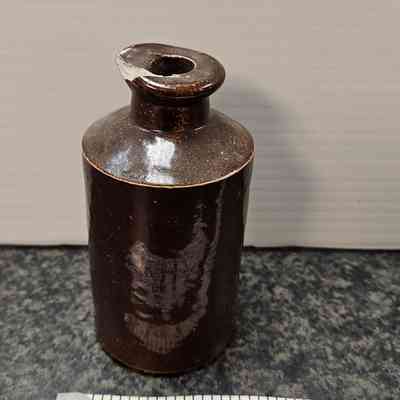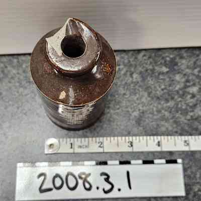 Ink bottle, earthenware with dark brown glaze; pouring lip; marked "6" (stamped heavily); a "20" within circle of letters (unreadable); c. 1900.Dimensions