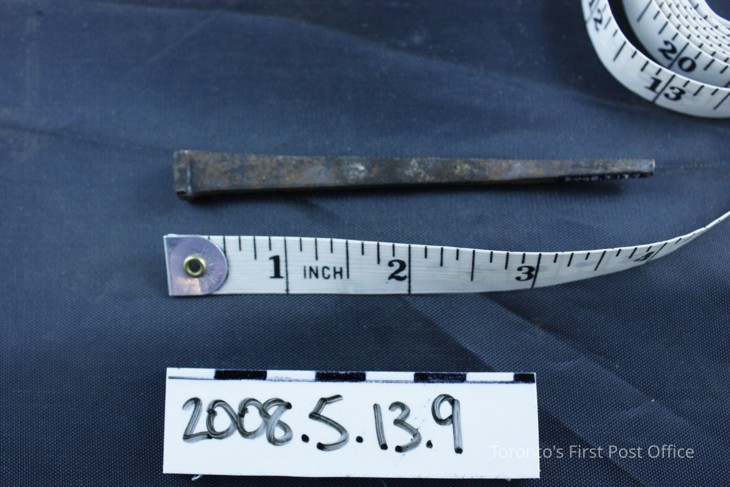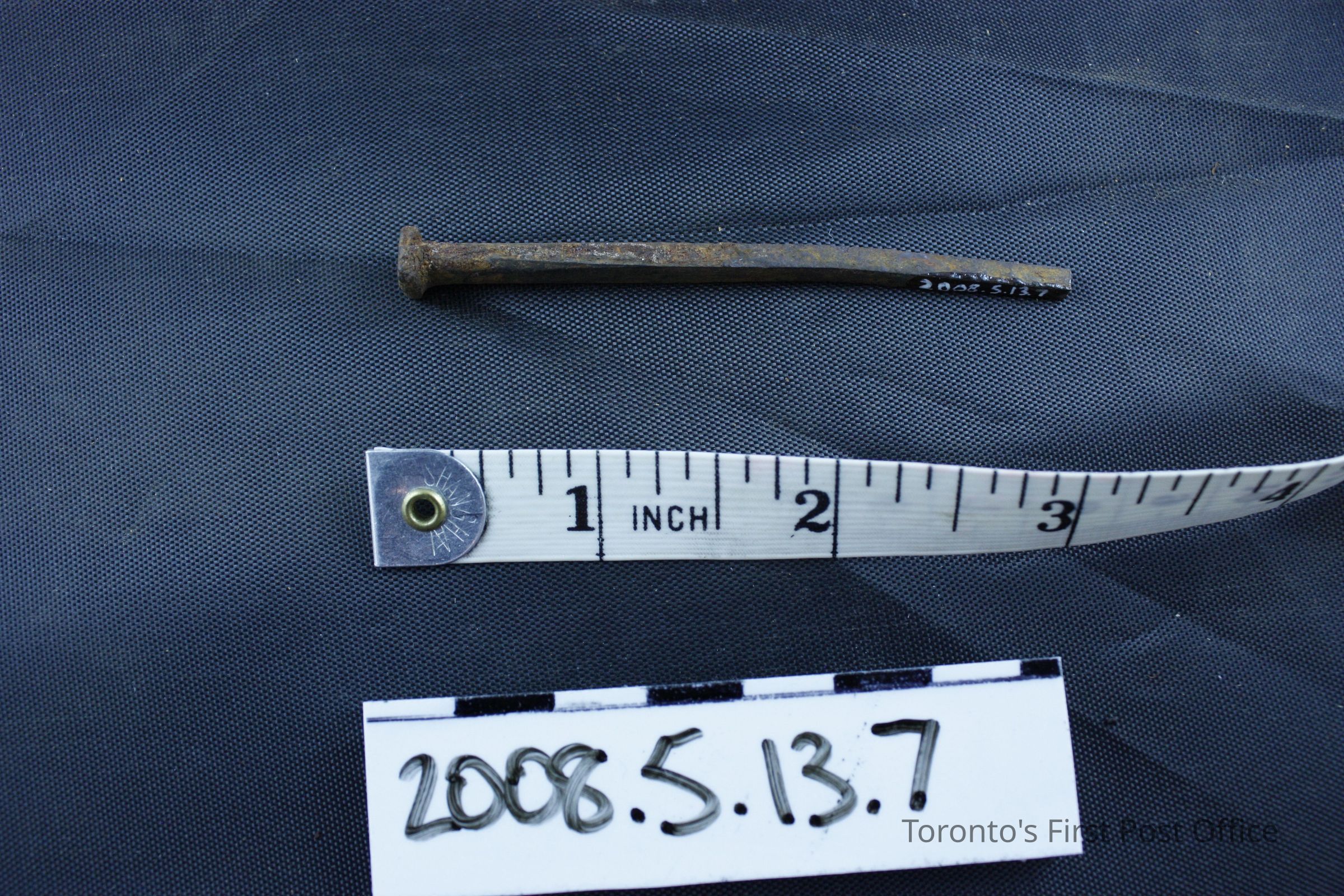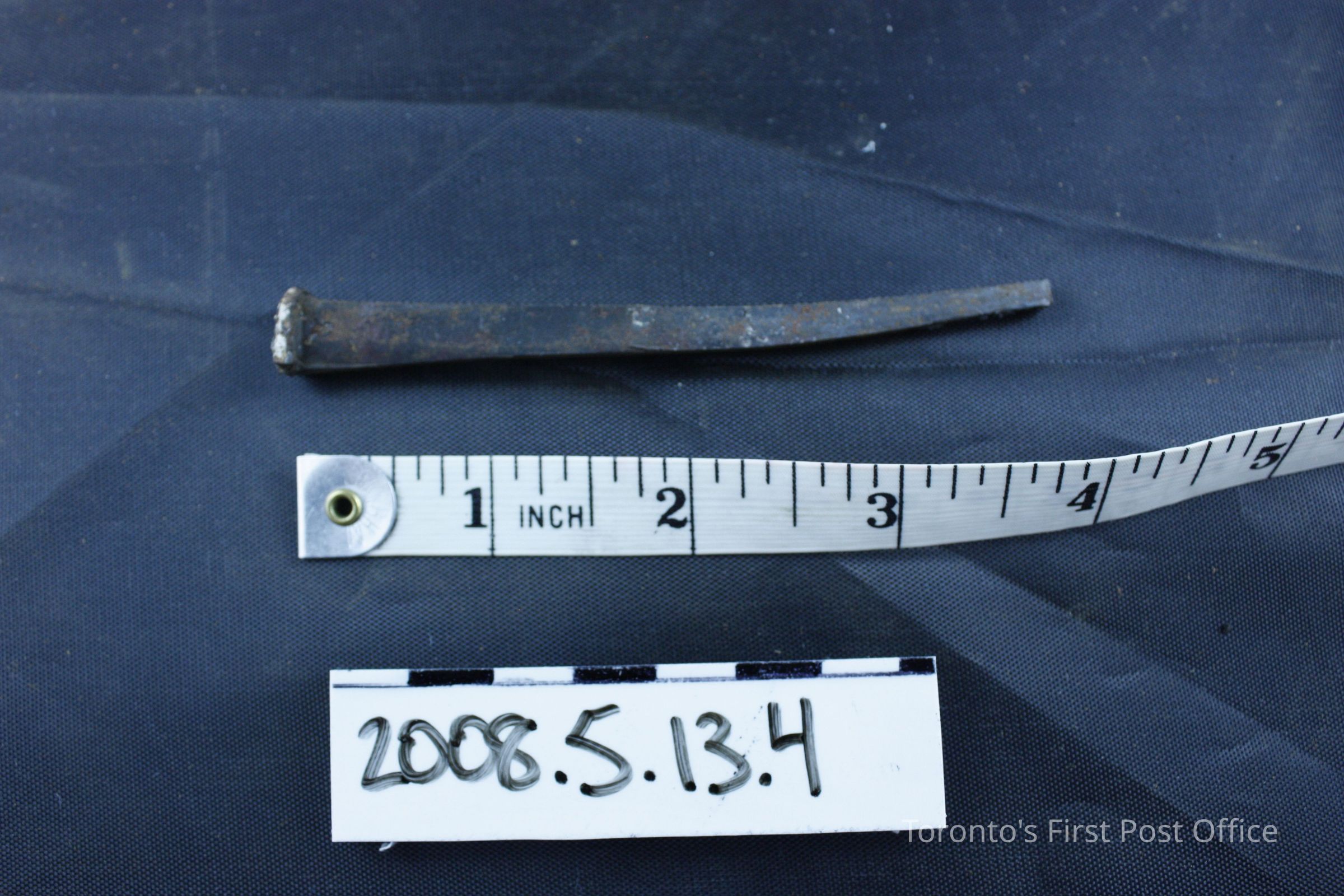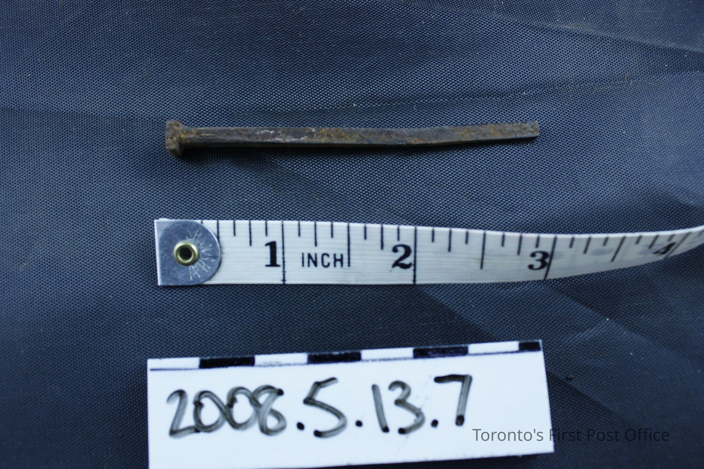Nineteen iron nails; some bent or split at one end; some spotted with paint or other unknown compounds; all square heads except .2 which has a large circular head.Dimensions