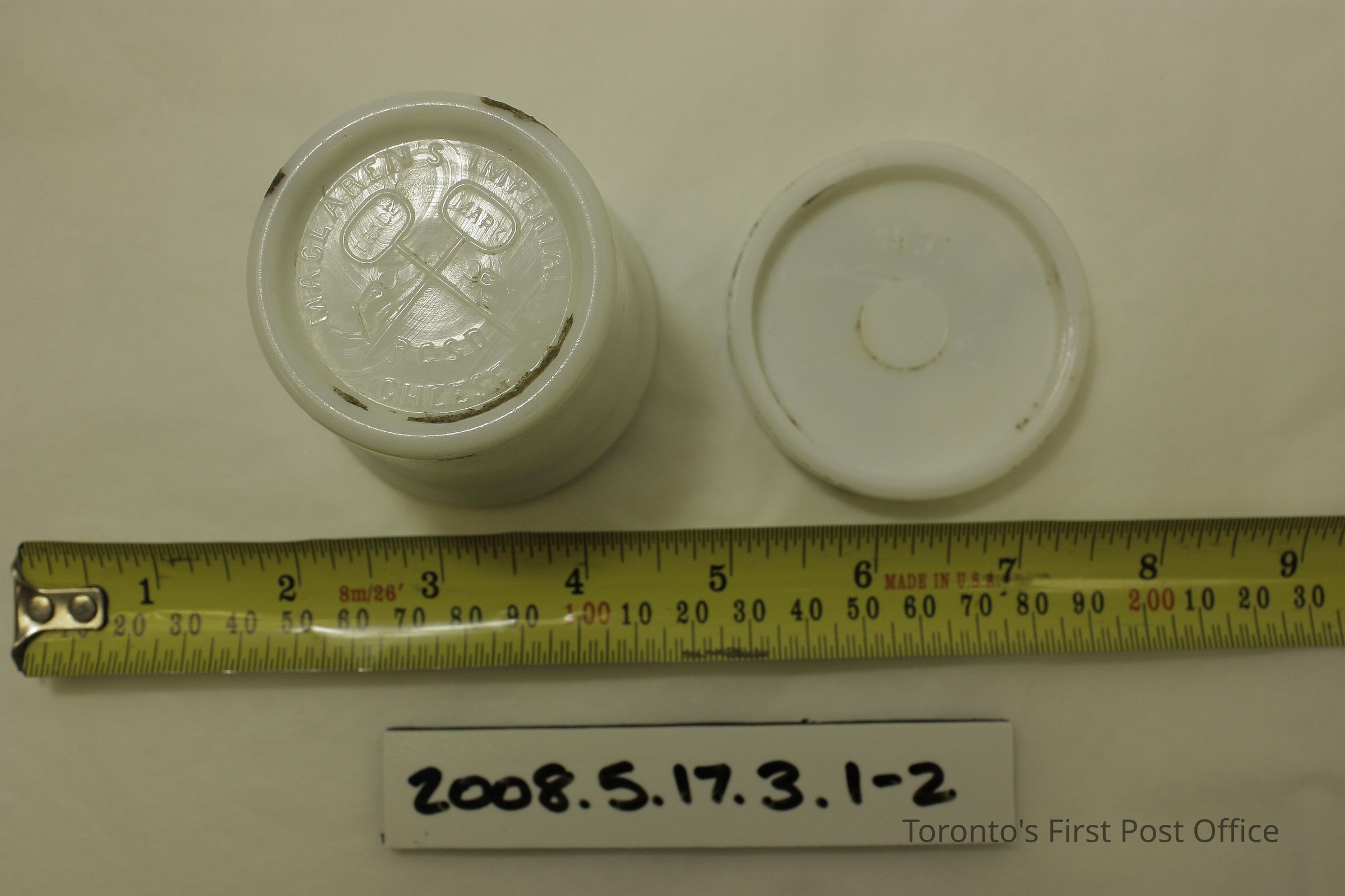 Three milkglass cheese containers as follows: .1: no lid, residue on interior, residue and label remnants on exterior; .2.1-2: jar with lid, residue on interior, residue and label remnants on outside, "Mou…" visible on label; .3.1-2: smaller jar with lid, residue inside and out, lid interior embossed "M.T."; all jar bases embossed "MACLAREN'S IMPERIAL CHEESE TRADE MARK RCSD" with symbol including two cows' heads; all jars 2 piece construction.Dimensions