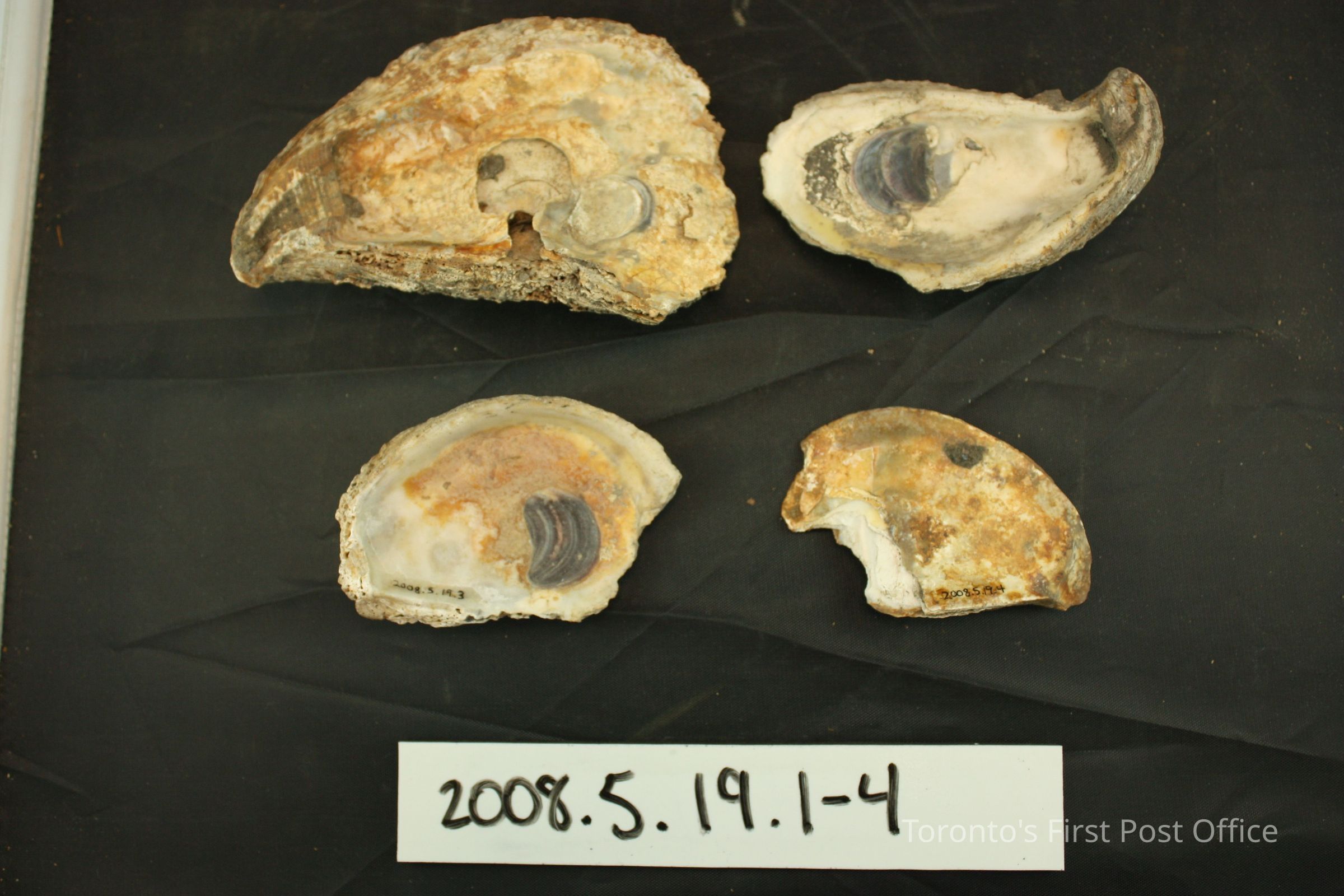 Four half clam shells; .1 and .3 very porous; .1 and .4 residue throughout; pieces broken off edges of all.Dimensions