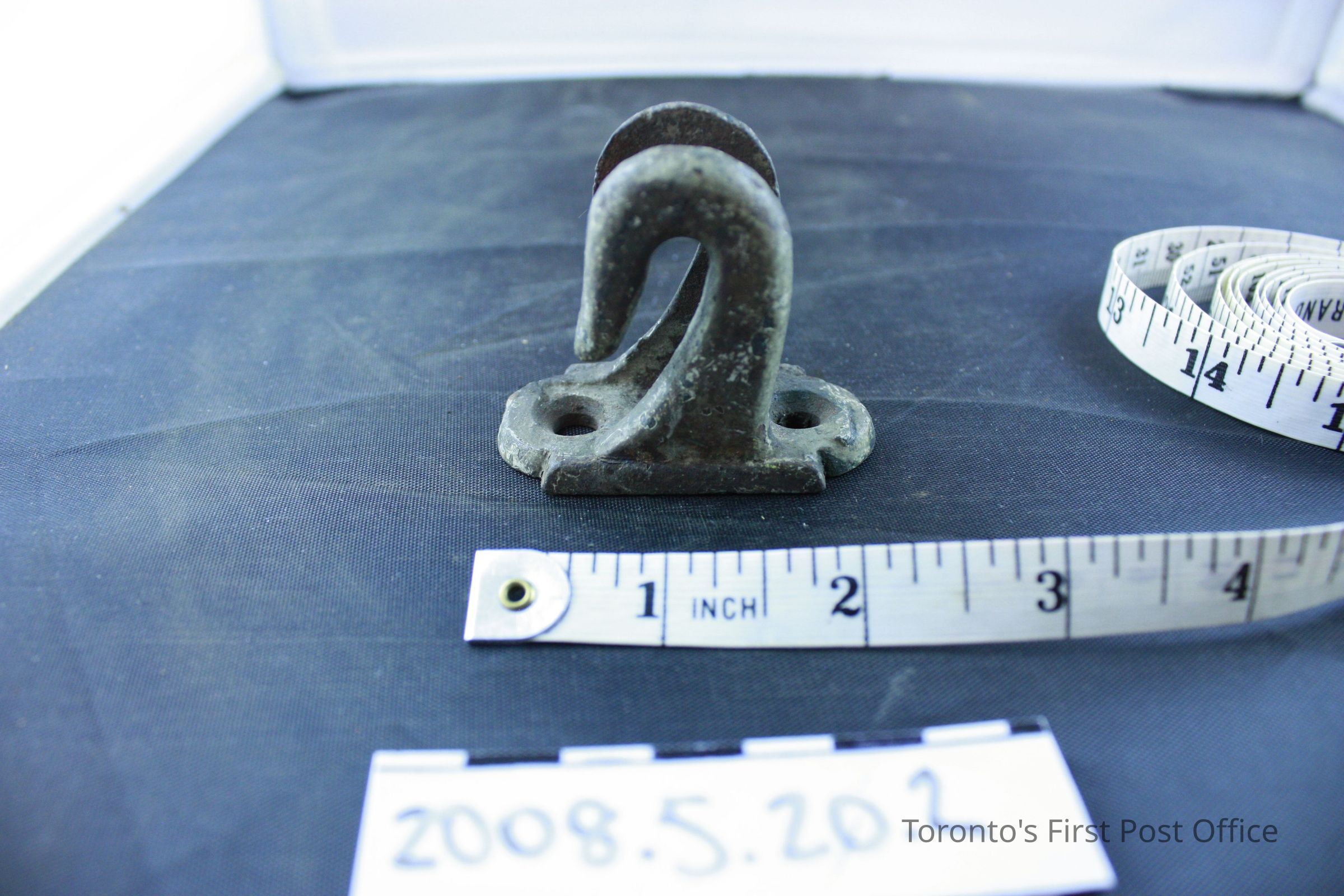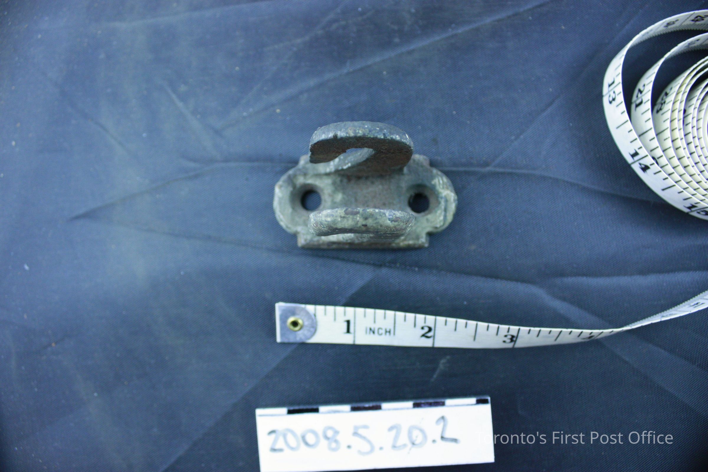 Four brackets; resemble two hooks on one base; iron; base has two holes for screws.Dimensions