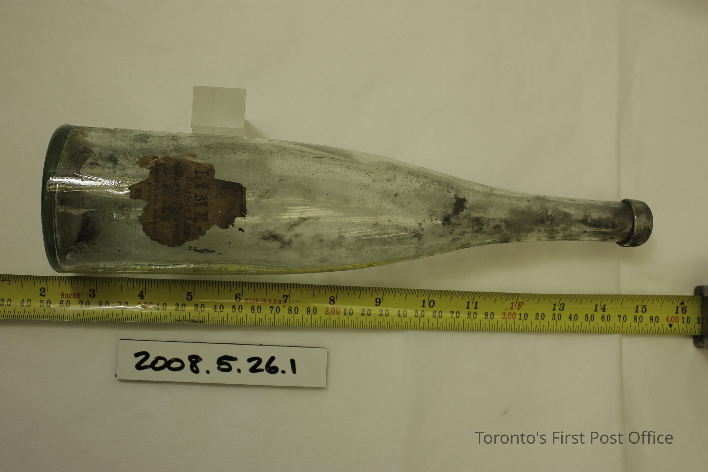 Two bottles; clear glass; 2 piece mould; embossed on bottom: "EVANS SONS & CO L-POOL"; .1 also embossed on bottom "710"; .2 also embossed on bottom "870"; label on .2 (partial): "LIME GUARENTEED… RIFIED AND PRESERVED… IT FORMS… and with three to six times its bulk... of Water... WH".Dimensions