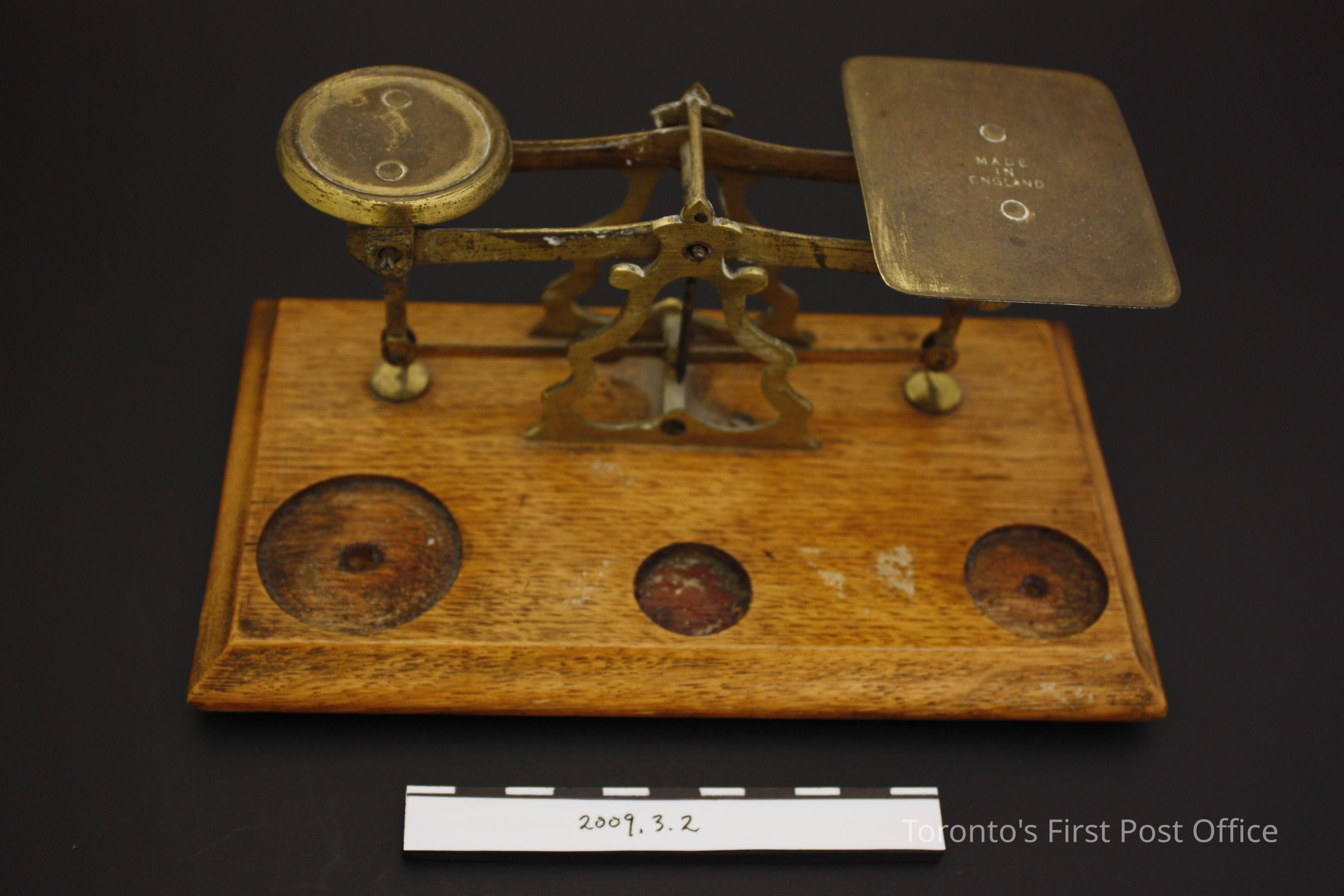 Postal scale; on footed oak base with bevelled edges; two brass trays - one circular withy small edge; one rectangular and with rounded edges, marked "MADE IN ENGLAND" - each supported by two brass arms; three insets in bae for weights; centre insert bottom painted dark red; weights are all bright brass; weights are as follows: 4 oz (.2.1); 2 oz (.2.2); 1 oz (.2.3); 1/2 oz (.2.4); 1/4 oz also marked with crown and VRC (.2.5); c. 1850-1860.Dimensions