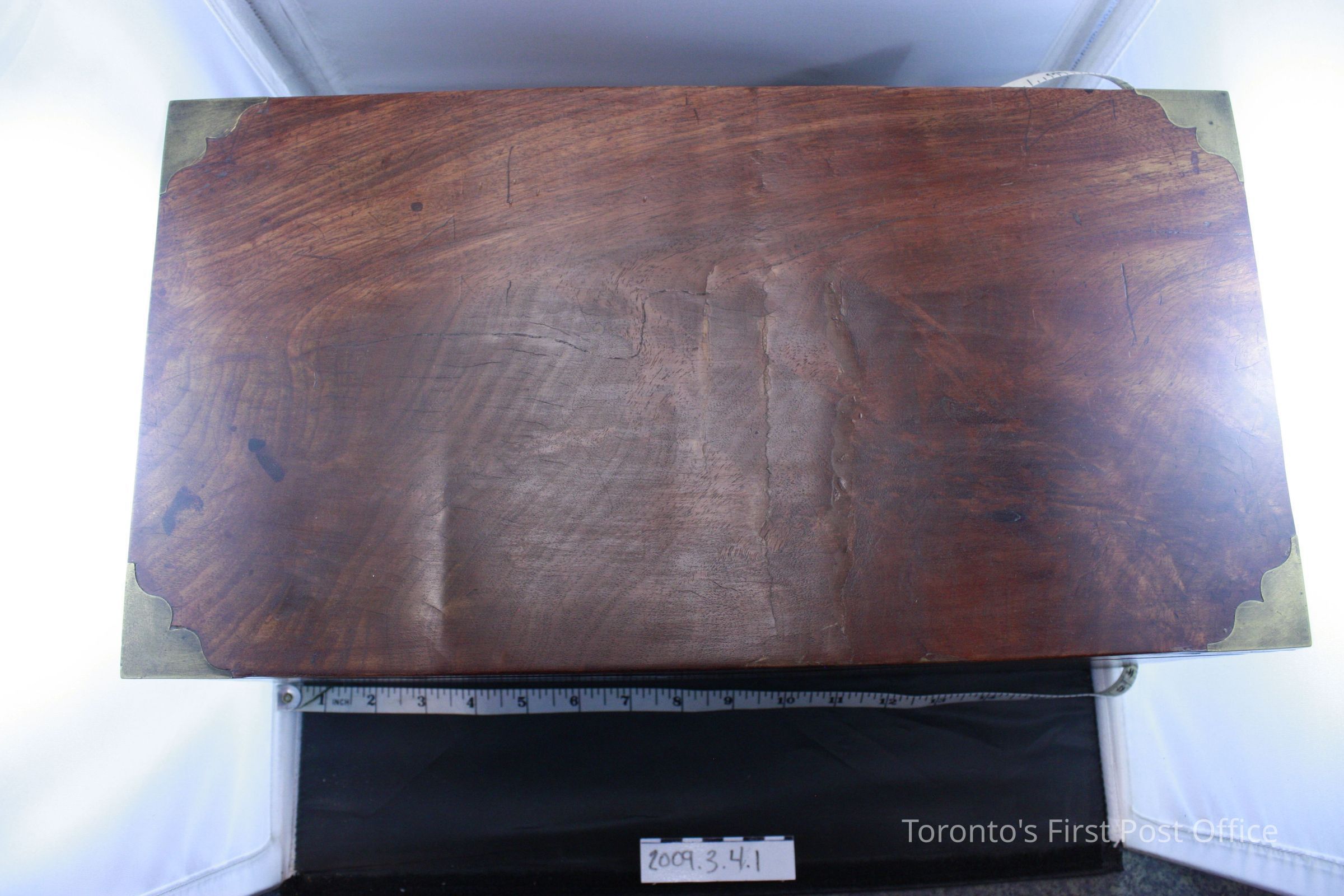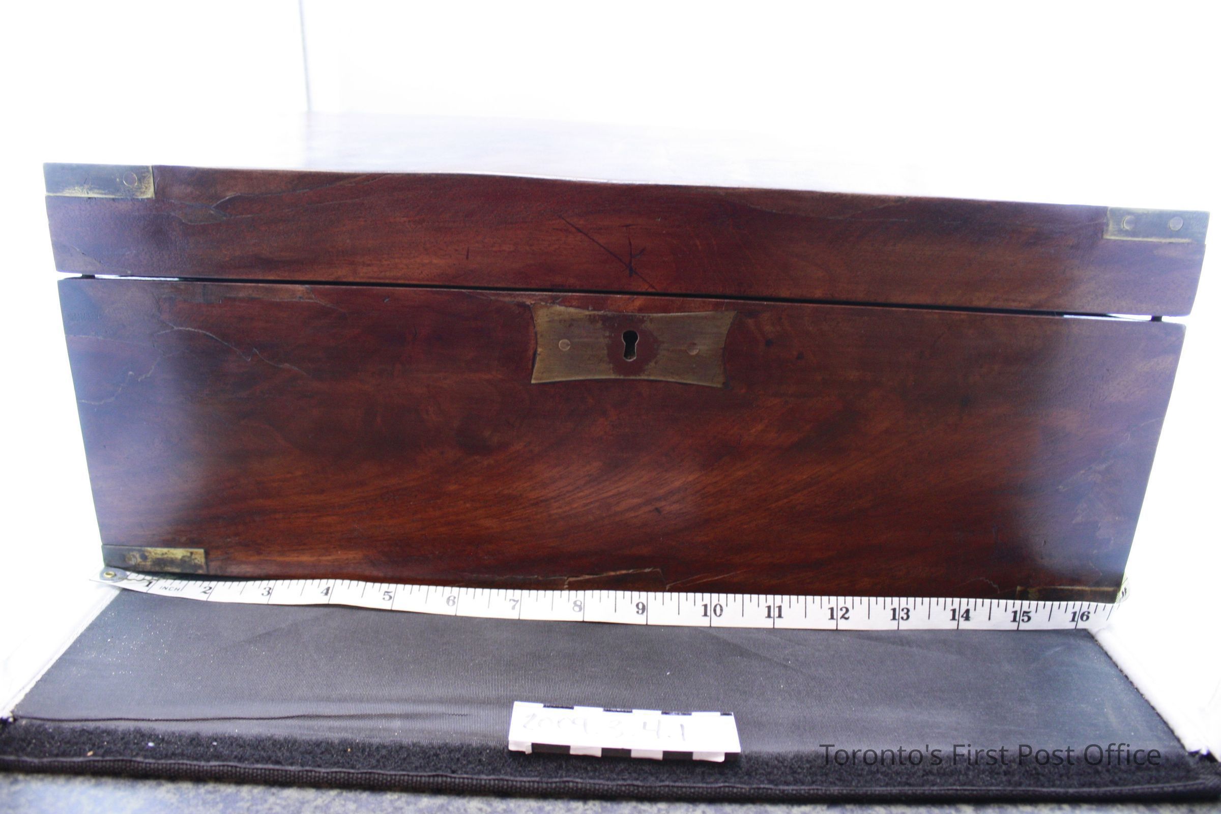 Lap desk; mahogany veneer; four brass corners; brass faceplate; no lock; two brass hinges; green woven material glued onto bottom; interior writing surface is slanted and covered in blue velvet; two storage compartments under each half of the writing surface; three compartments at top of writing surface; two include wooden pen troughs which are concave on one side; third compartment includes a non-original glass inkwell with loose brass cap; circa 1850.Dimensions