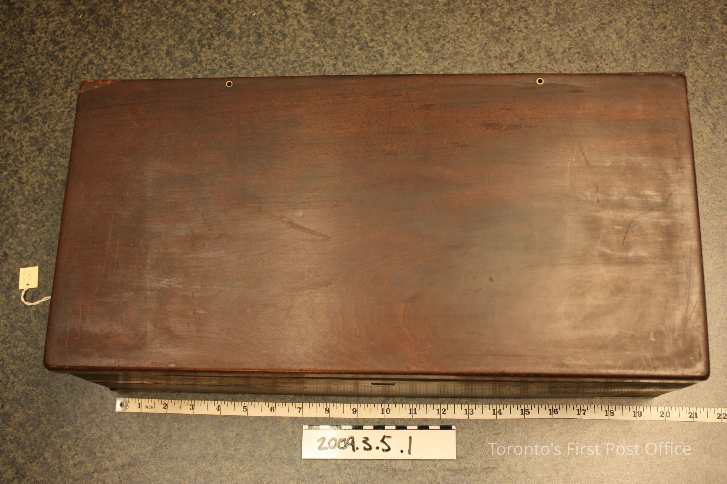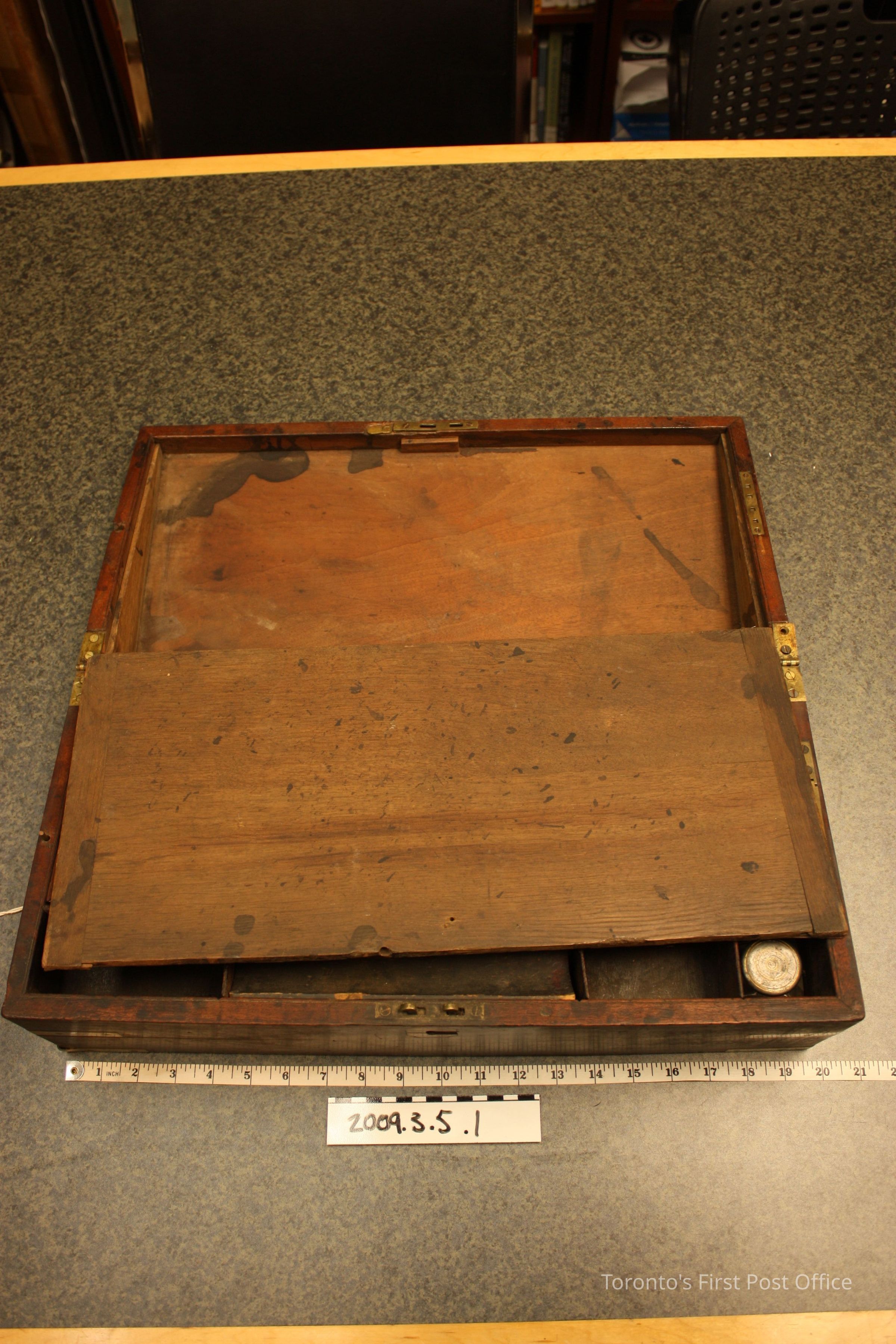 Lap desk; wooden; twelve brass straps at all corners and at hinges; two brass hinges; faceplate missing; interior writing surface is dark navy blue velvet; two storage compartments under each half of slanted writing surface; four compartments at top of writing surface; one compartment includes a pen trough, concave on one side; one compartment includes a glass inkwell with screw-on brass cap; full-length drawer with handle on one side; handle only on other side; interior flip-up brass supporting arm; brass socket for arm also on interior right; c. before 1812.Dimensions