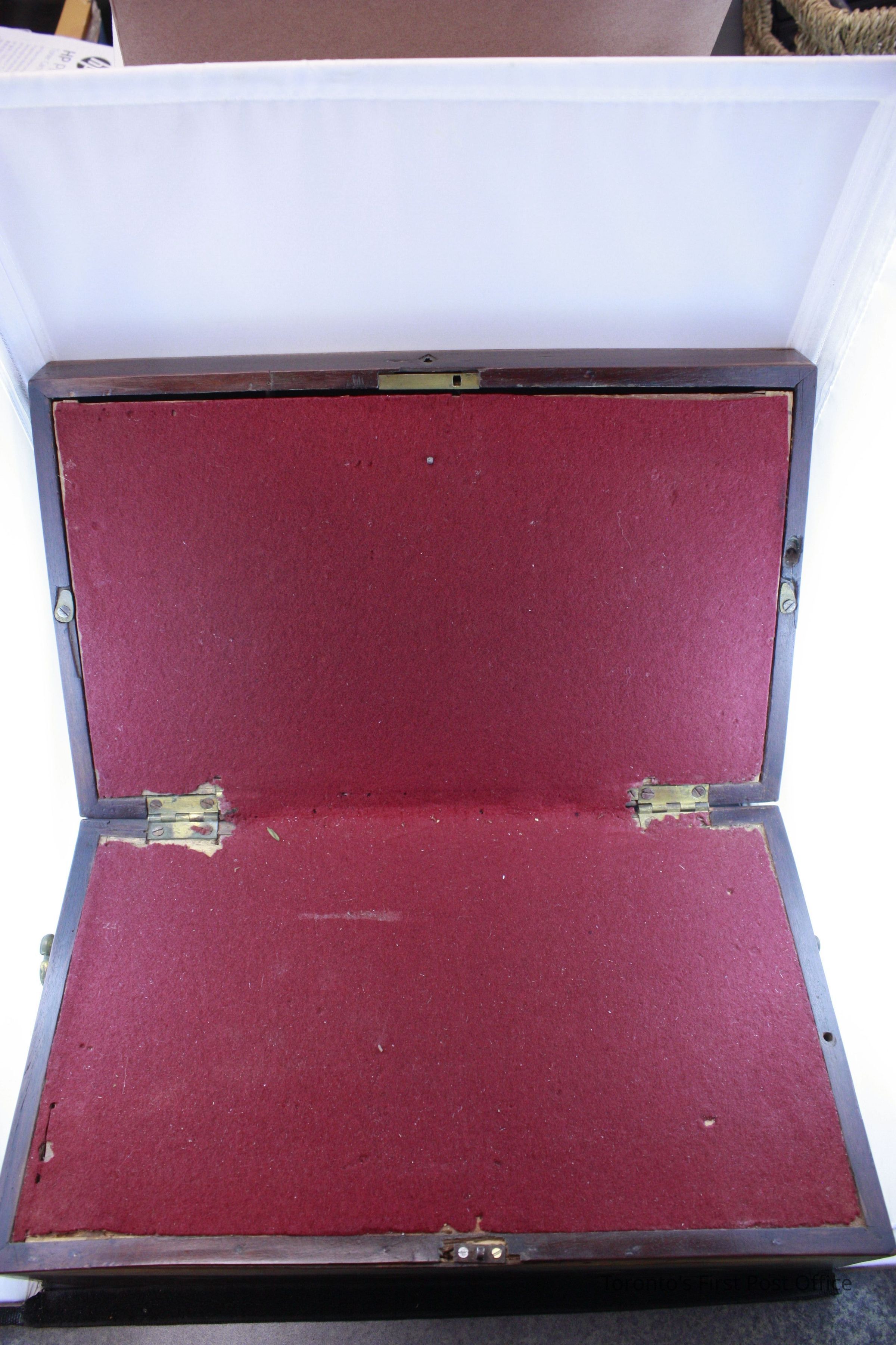 Lap desk; rosewood; sunburst inlaid marquetry on top; small diamond-shaped brass faceplate; single post lock; two handles - one one either side; full-length drawer (post lock missing) on one side with false bottom; interior writing surface is replacement red felt; two brass hinges; storage compartment divided in two under lower writing surface; c. 1850-1870.Dimensions