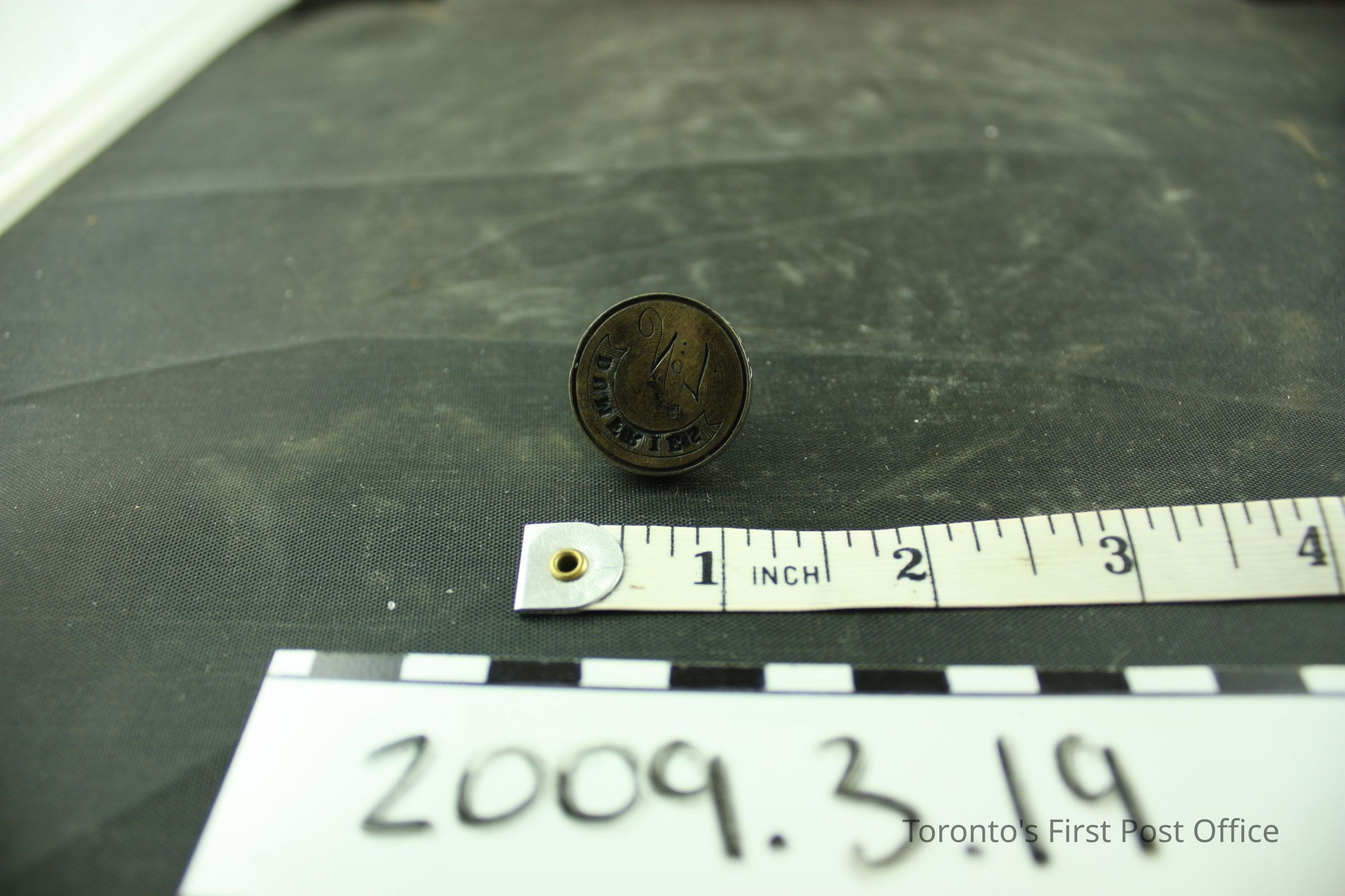 One seal head (no handle); brass; flat, circular seal is banner with block lettering "DUMFRIES" above script "No: 7."; screw tip for missing handle; c. 1850.Dimensions