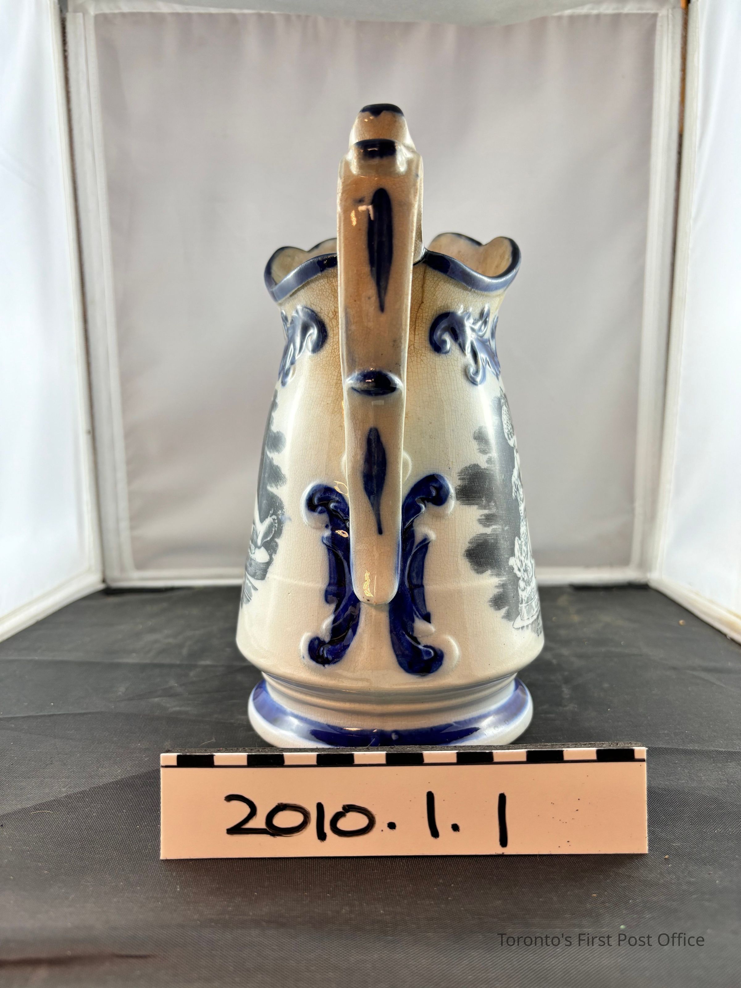 Pitcher. English, ceramic souvenir from The Great Exhibition of 1851 in London, England. Base white glaze with blue accent glaze on lip and foot, relief accantus leaves, and handle scroll decoration. Black transfer print on either side of the body, depicts 'Boy with punchinello' and 'Gratitude', images of sculptures. Relief face on underside of spout.Dimensions