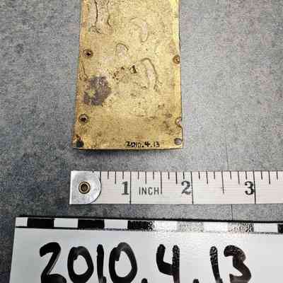 Brass rectangular plate with slight concave curve in its form. Had a raised figure eight design, embellished with floral leafing. Four holes in each corner of the plate, with an additional six holes.Dimensions