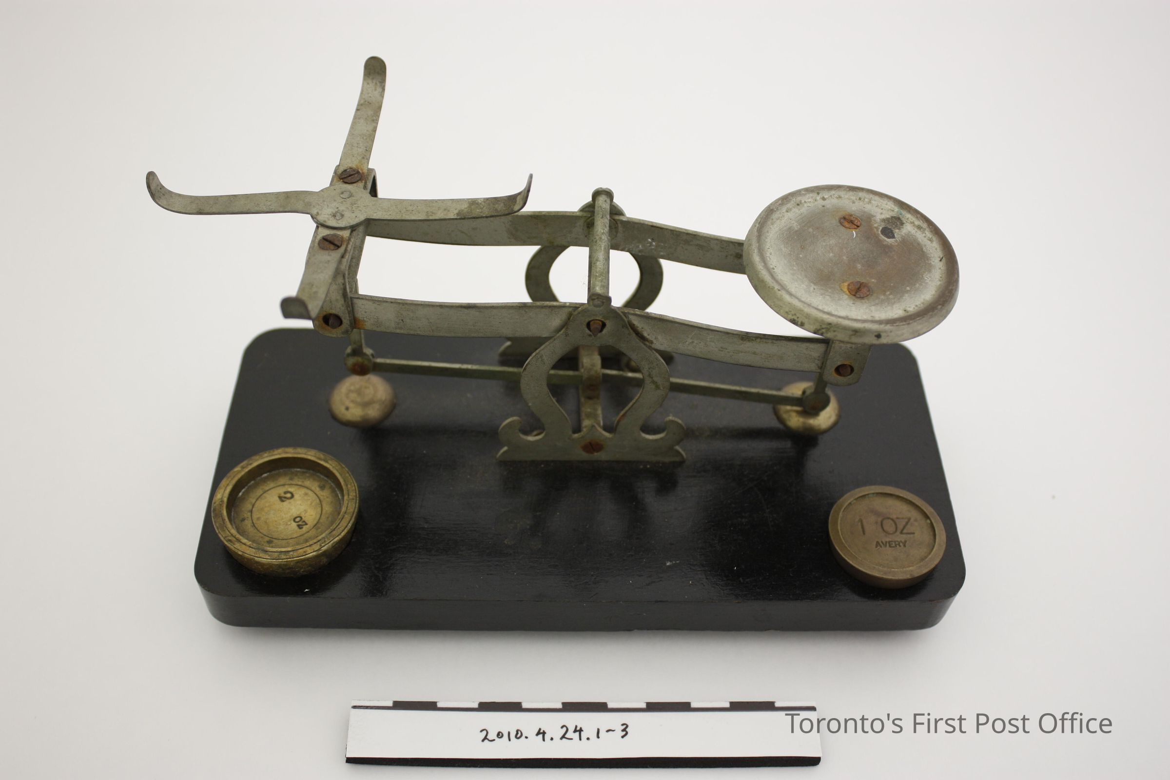 Wooden footed platform with mismatched metal pans. Two ounce weight and one ounce weigth nested in base.Dimensions