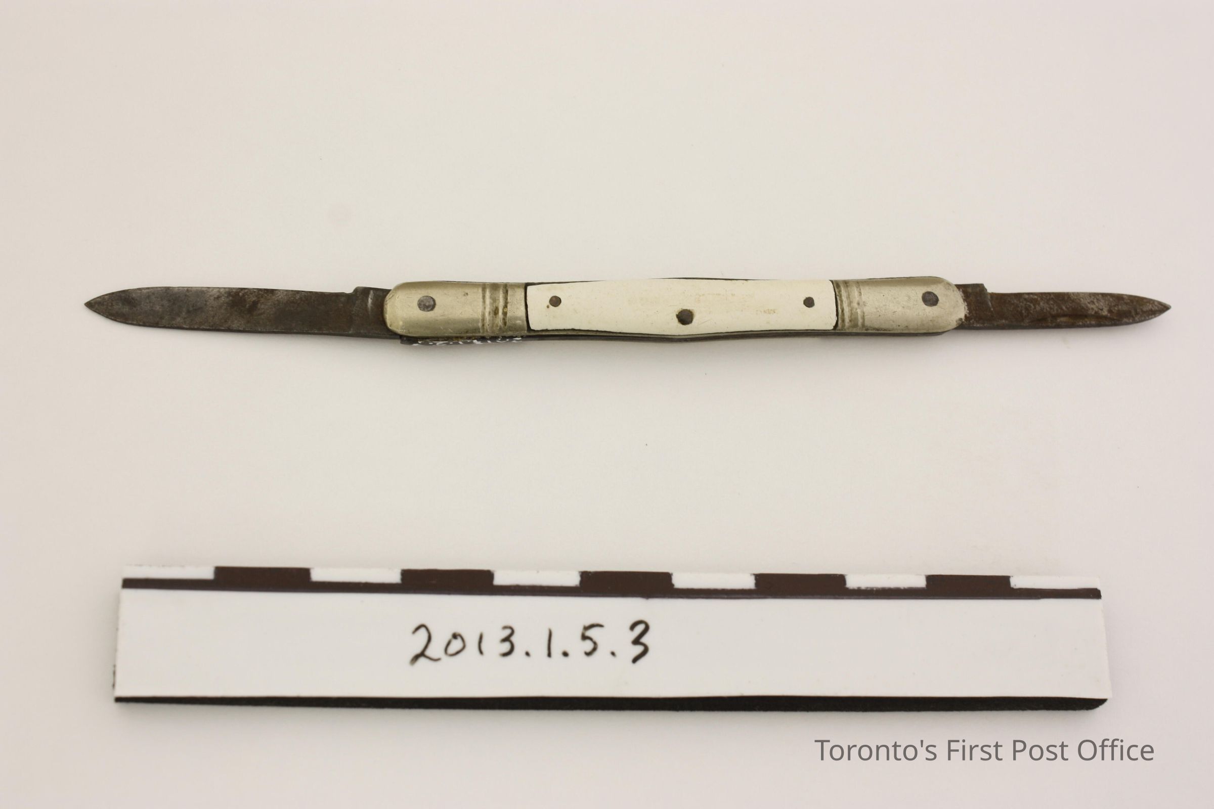 Pen knife. Two-blade, collapsible knife. Steel blades held within a light yellow alloy outer case with white enamel inlaid sides. Enamel inlays are attached with three (3) metal pins. Blades are marked 'Argyle Cutlery Germany'. Circa 1880-1890.Made/Created