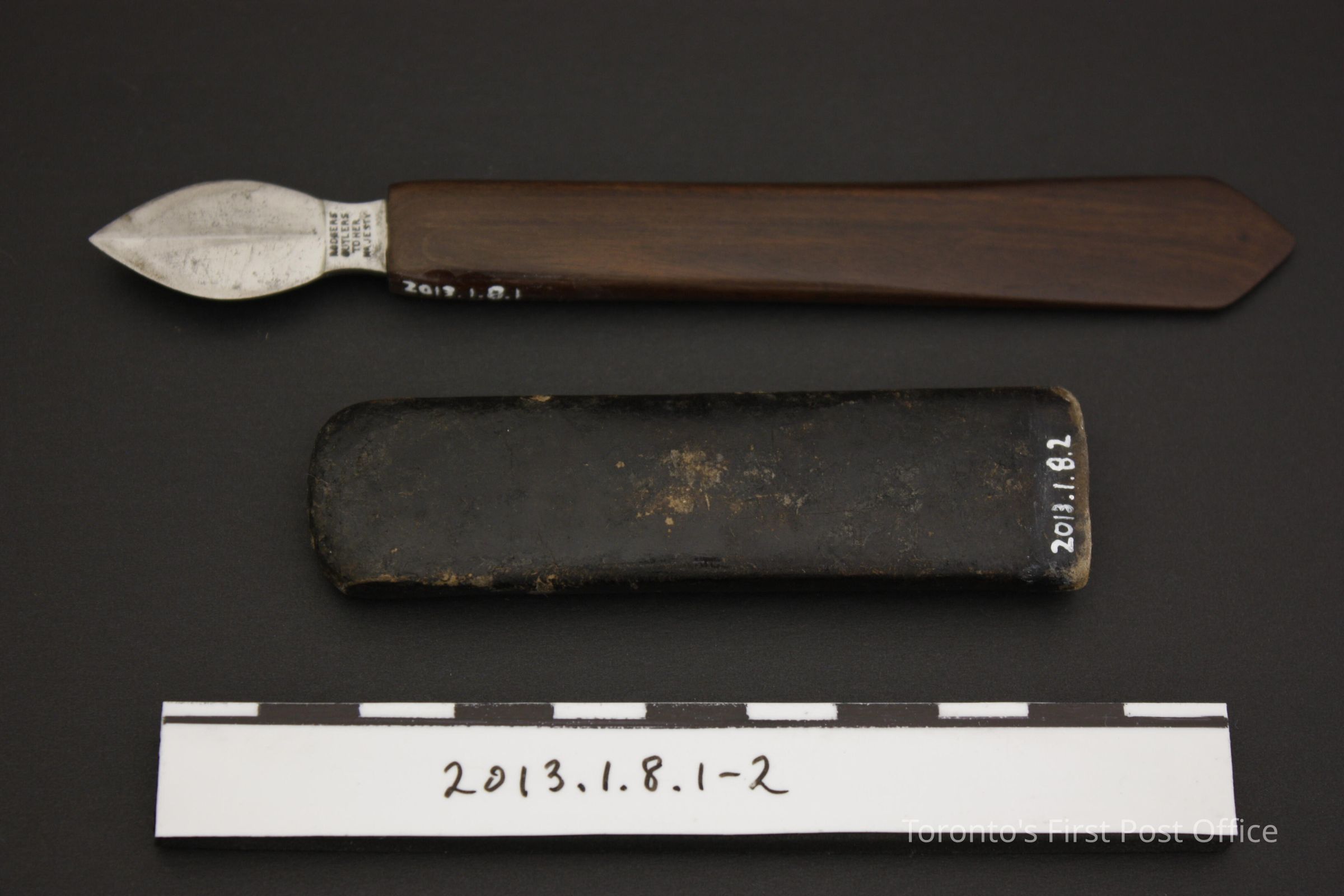 Double sided steel blade eraser knife with dark wood (Rosewood?) handle. Blade shaft has markings on both sides: two symbols, a star and a cross above 'Sheffield England' on one side; 'Rodgers Cutlers to her Majesty' on the other side. Hardened paper sheath with black coating, embossed with the two symbols, a star and a cross next to lettering 'Joseph Rodgers & sons / Sheffield'.Dimensions