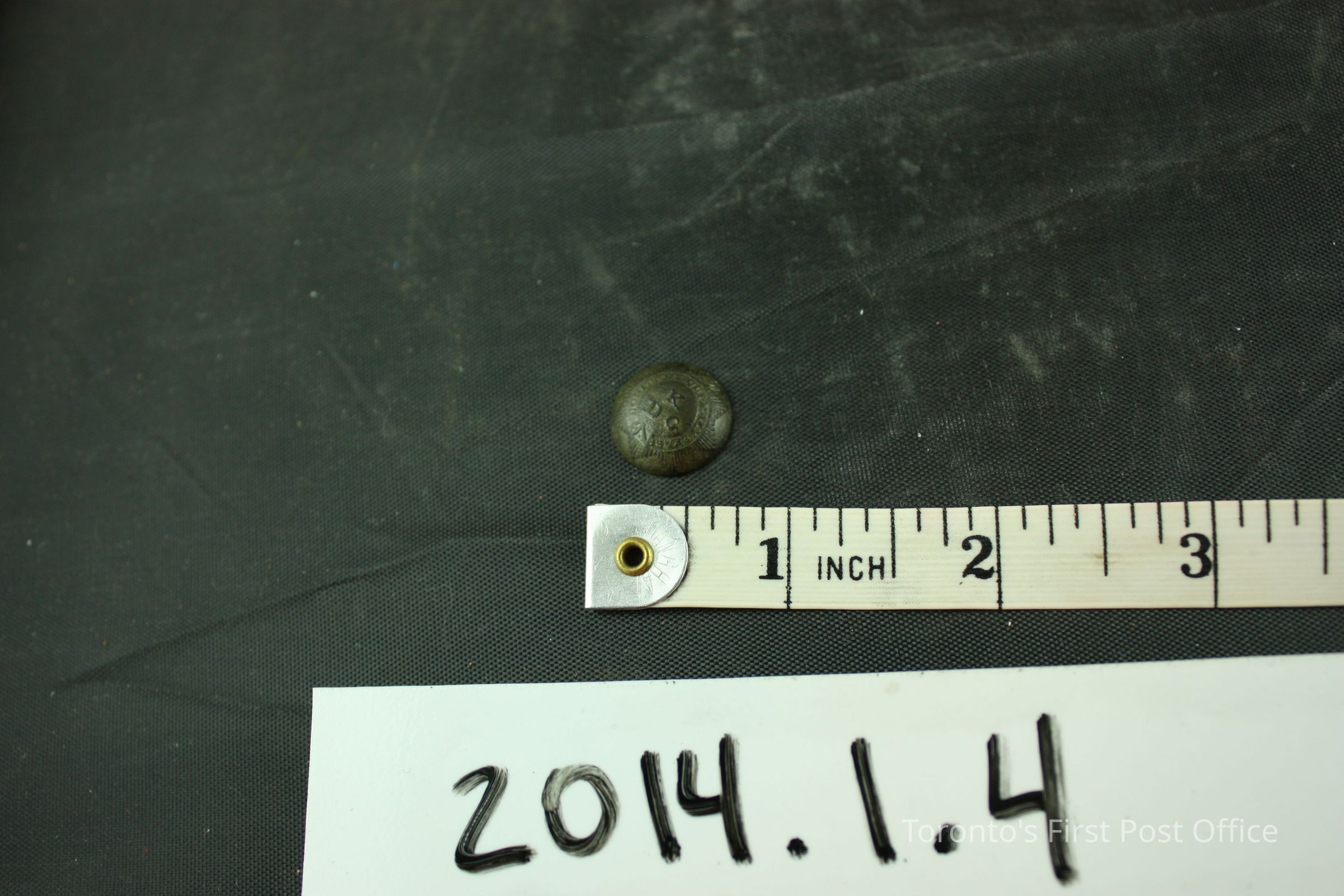One sleeve button, brass, domed face, 'KDG' surrounded by belt with 'Honi soit qui mal y pense' surrounded by crown, no shank.