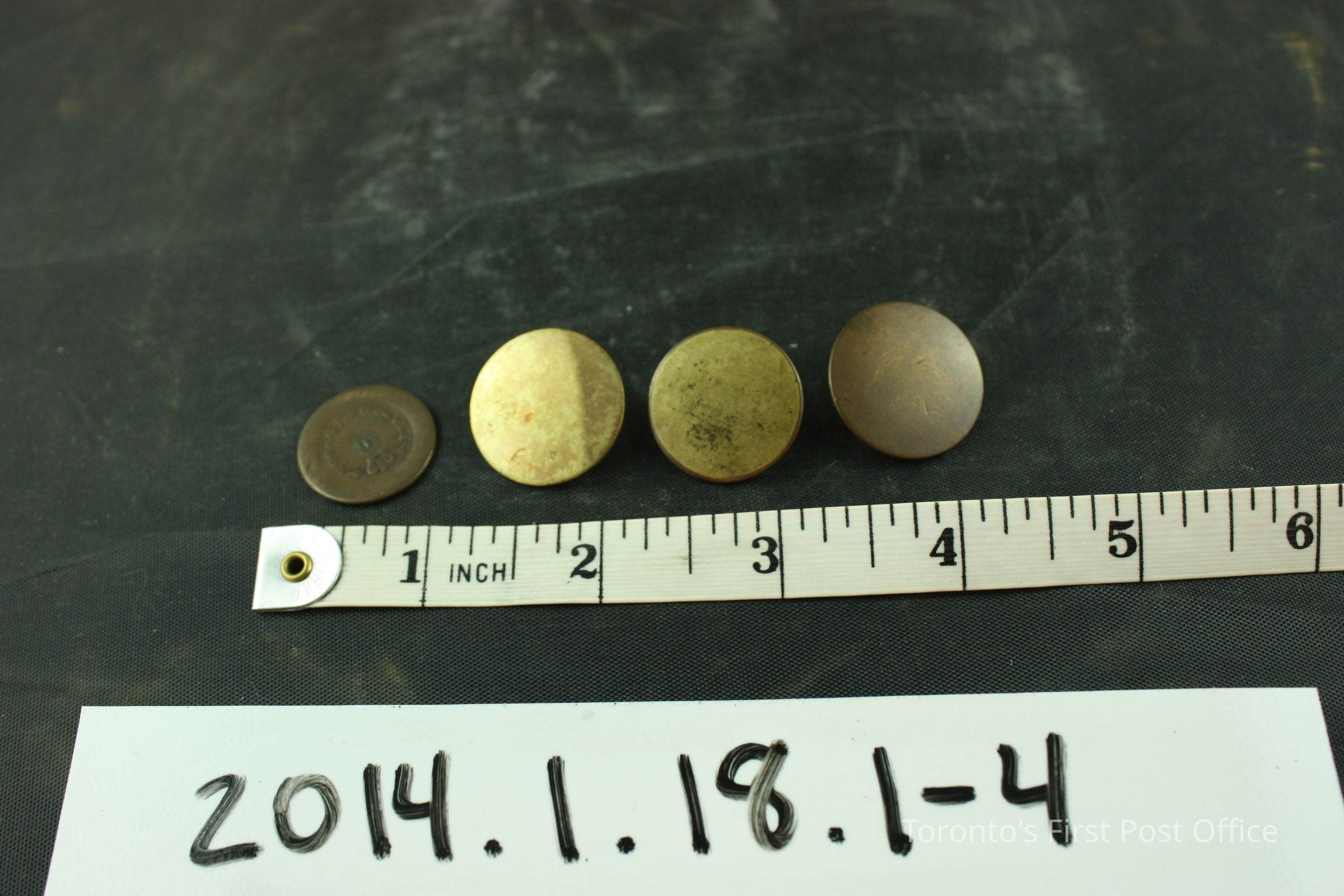 Four (4) buttons, brass, plain obverse, flat, as follows: . .1: loop shank, reverse 'Treble gilt' and Georgian Crown .2: loop shank, reverse 'Gilt' under Georgian Crown with wreath .3: loop shank, reverse 'Double gilt' under Georgian crown with two stars .4: no shank, reverse 'Plated' 'London' under Georgian crownDimensions