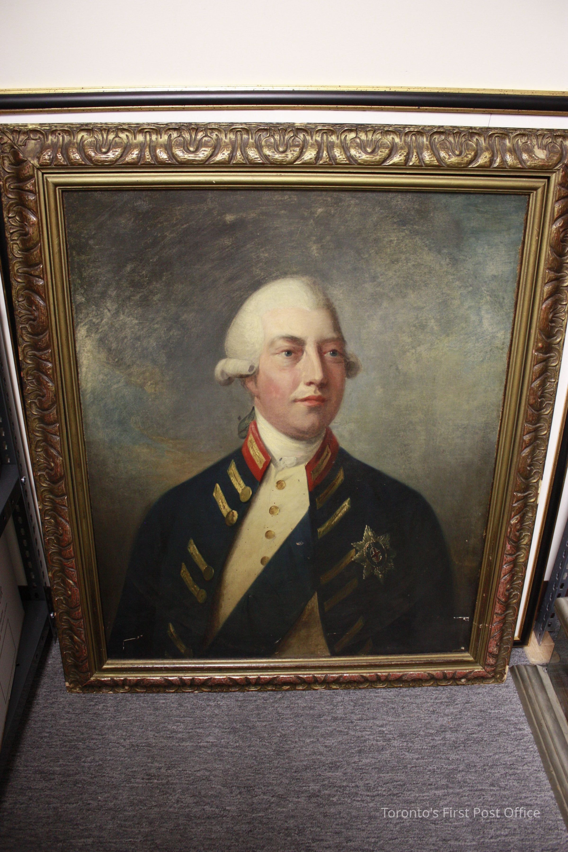 Framed oil painting of a portrait of King George III (1738-1820). Painting is done by the artist William Berczy (1744-1813) and is a copy of another portrait of King George III done by Thomas Gainsborough (1727 - 1788) in 1781. In the painting, King George III is wearing a Windsor uniform and ribbon. He also has the Star of the Garter on the right side of his chest.Made/Created