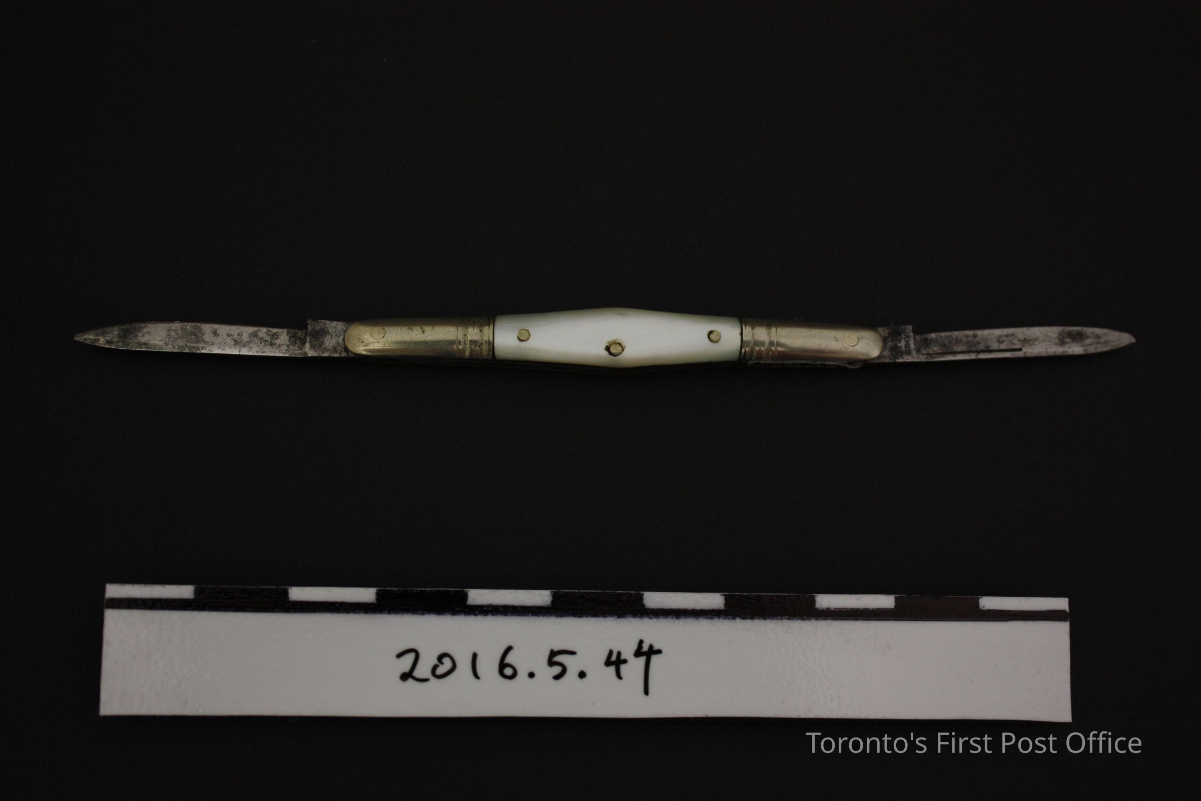 Pen knife. Two steel blade, collapsible knife in silver or nickel (?) outer case with mother of pearl inlaid sides. Inlays are attched with three (3) pins. Blades are marked 'J Dunbar & Co.'Update Date