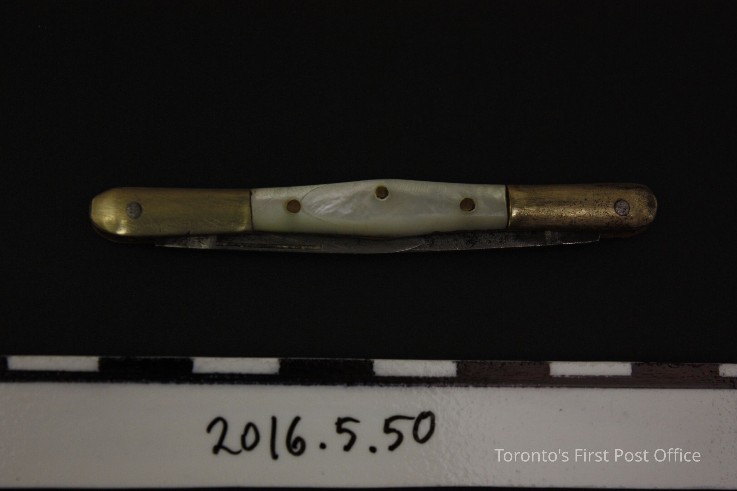 Pen knife. Two steel blade, collapsible knife in light yellow alloy outer case with mother of pearl inlaid sides. Inlays are attached to case with three (3) pins. Blades are marked 'Cook Bros'Update Date