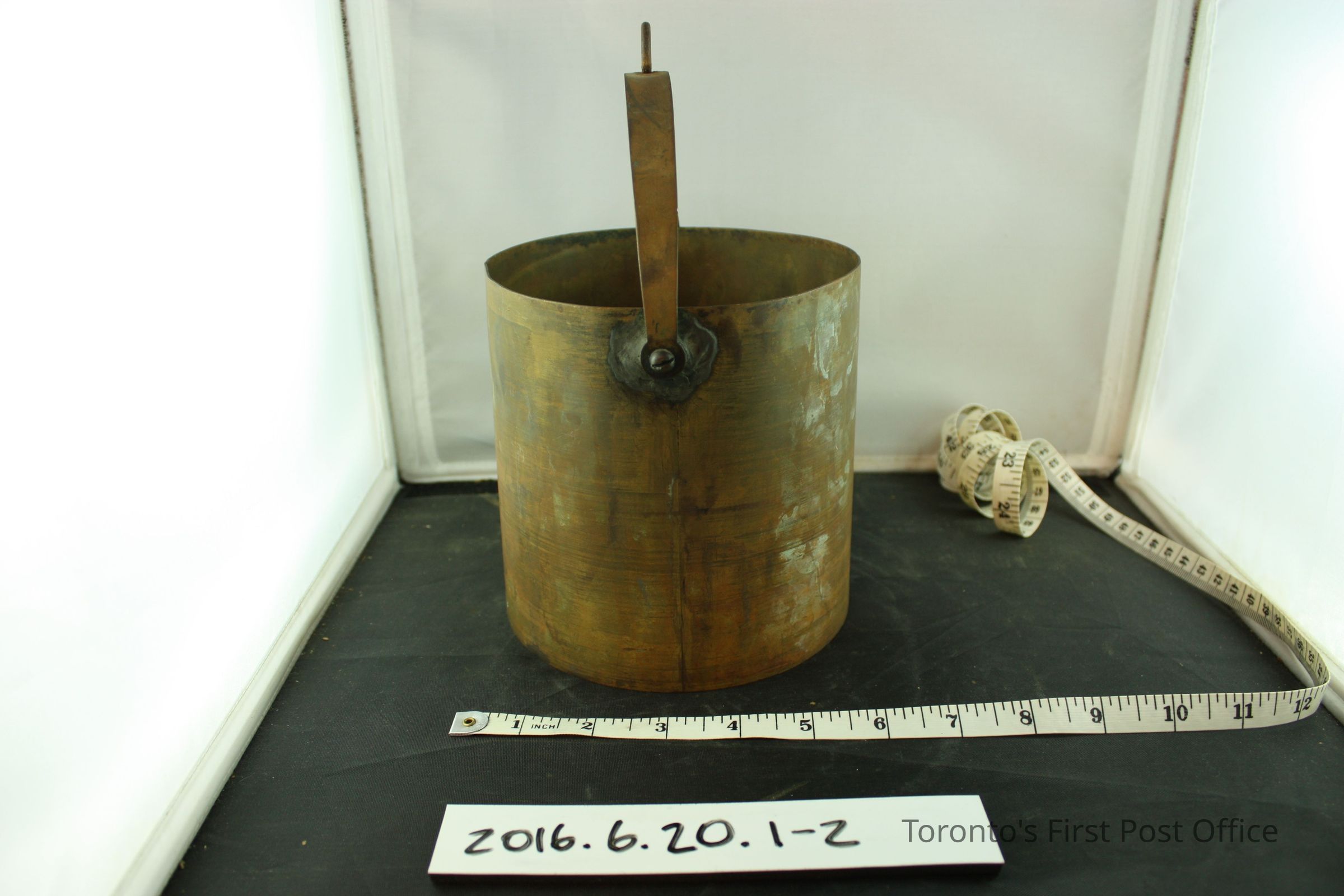 Brass hand held grain scale balance and measure container. Balance has a loop handle and a hook that attaches to a loop on the handle of the measure container. 'C. Wilson & Son/Toronto' on proper left end of balance. 'C. Wilson & Son/Toronto/1/16/Imperial/Bushel' on front of measure container.Dimensions