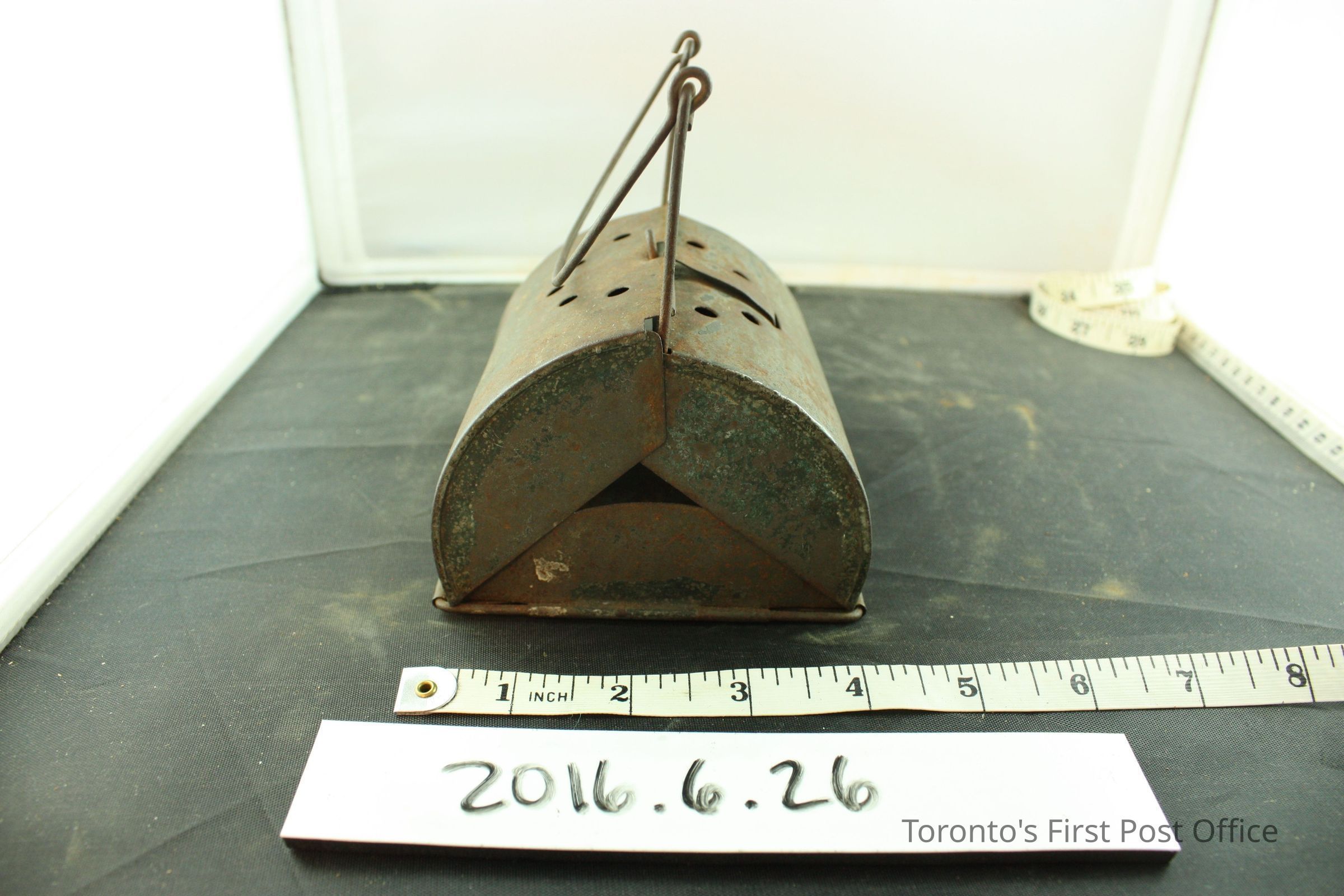 Tin folding lamp with rectangular base, domed lid and wire handle. 'Patent No. 57,988 William P. Smith, Louisville, KY, September 11, 1866. By its peculiar arrangment and construction, the lantern is capable of being folded into a compact form for transportation.' There is a paper label tied to it that says: "Smith's Patent Sept 11th 1866. W.P.X Smith. Sole proprietor Manufacturor Distributor." Folds open into three main parts; the rectangular base, half of the dome, and the other half of the dome. There is a latch to close it and holes creating circular shapes/decoration.Dimensions