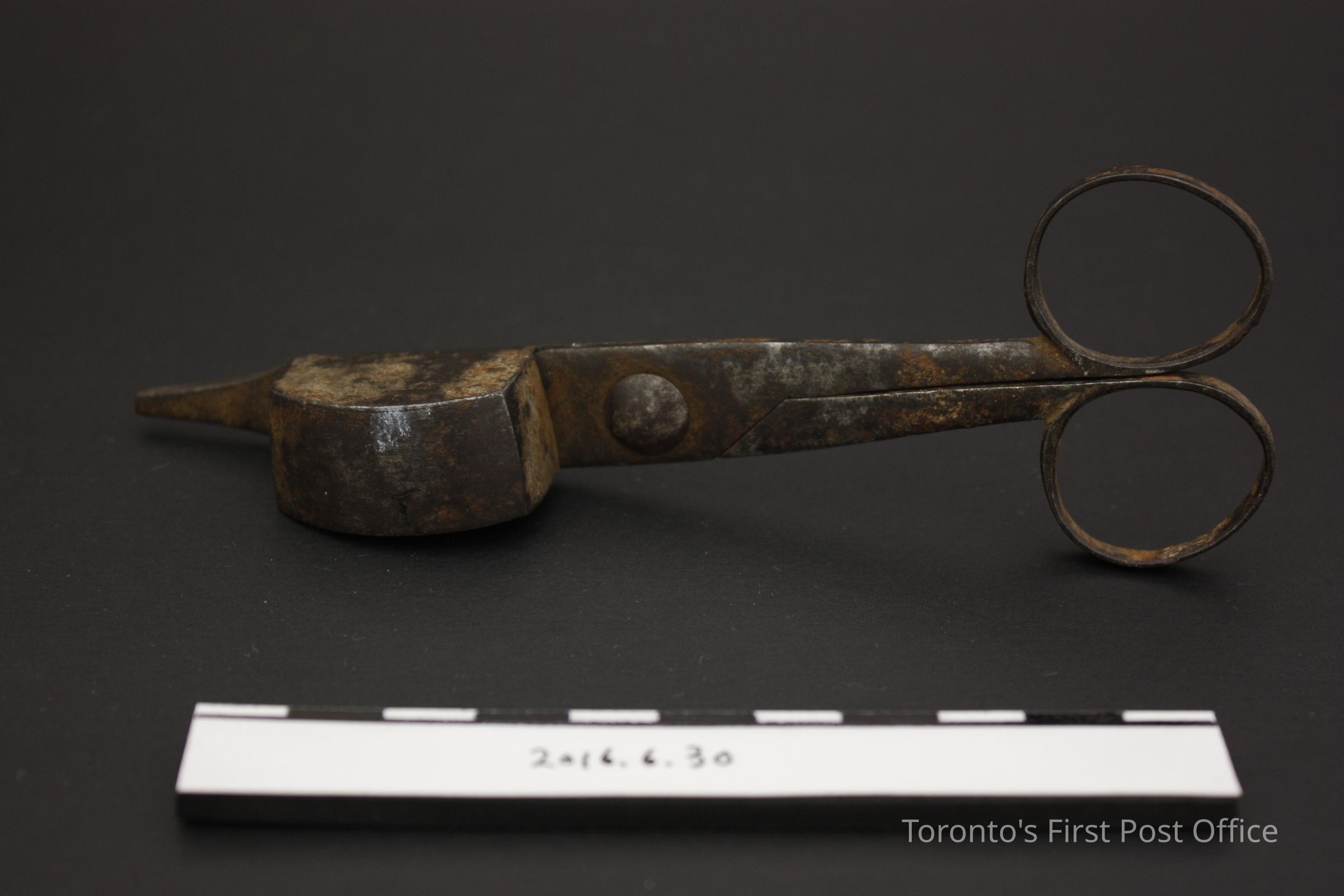 Iron candle snuffer with iron domed side plate box. Scissors-like in form, the base and sides of the snuff box are attached to the inner blade, while a flat cover for the side of the box is attached to the outer blade. Still in working order, the pivoted blades swing to full extension, secured by a large iron rivet. Very minimal and practical, no decorations.Dimensions