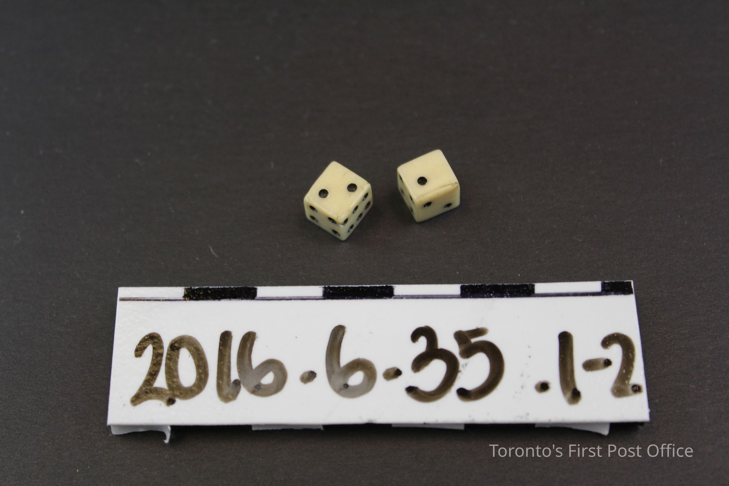 Pair of small white ivory dice with small drilled divets (pips), coloured black. One die is slightly larger than the other die.Dimensions