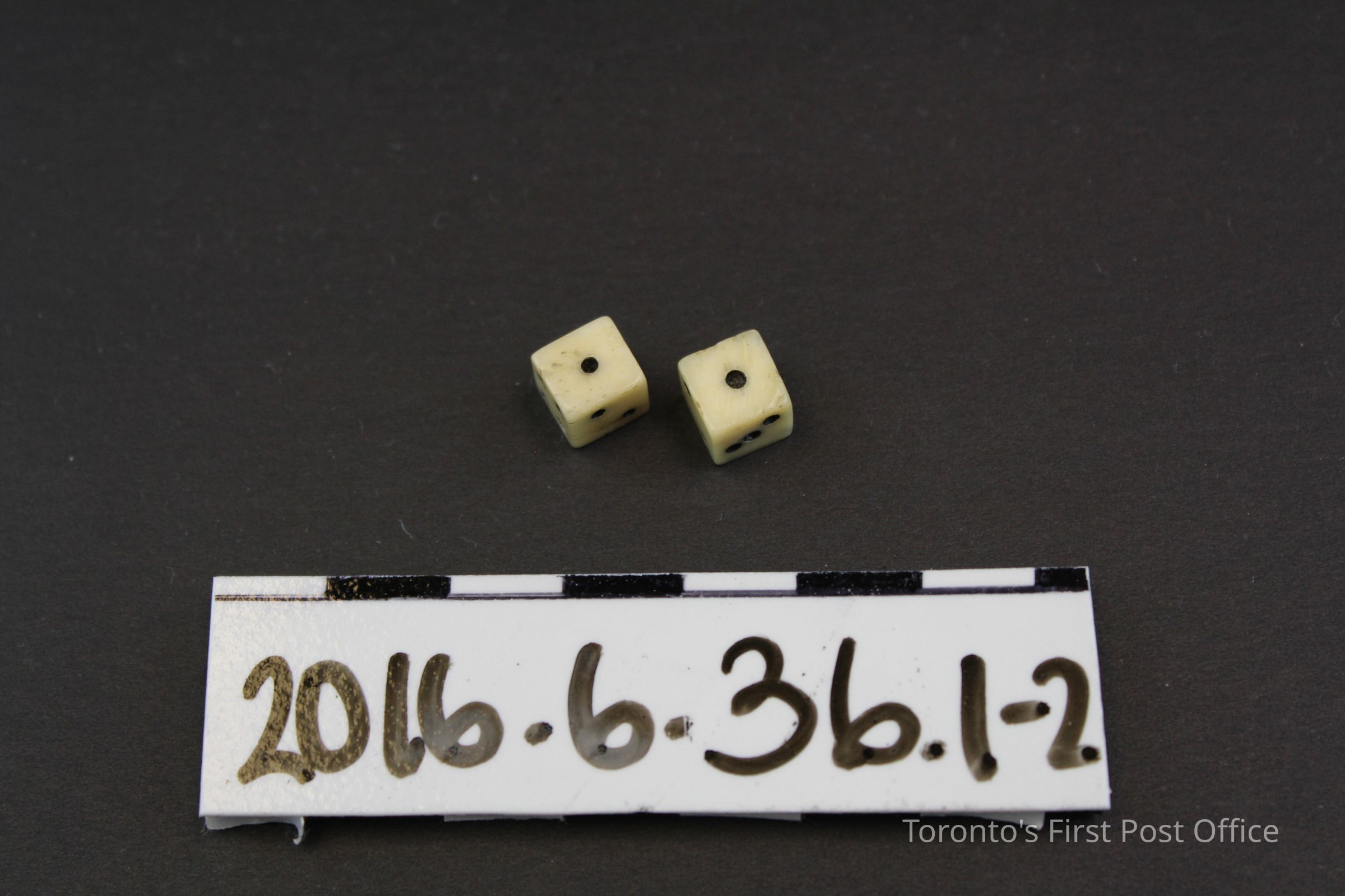 Pair of small white ivory dice with small drilled divets (pips), coloured black. Divet (pip) size differs between the two die.Dimensions