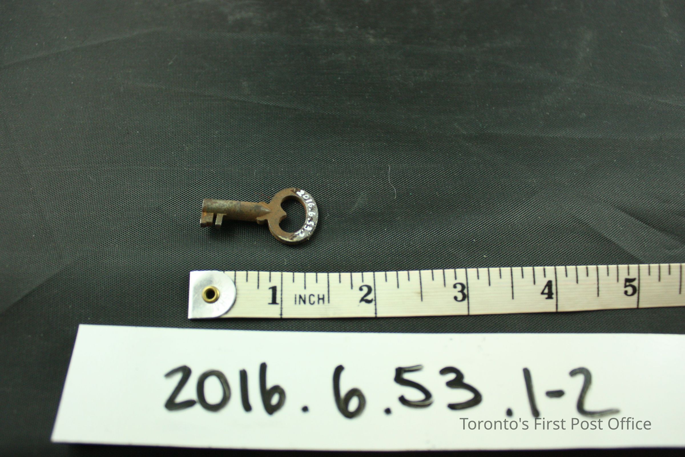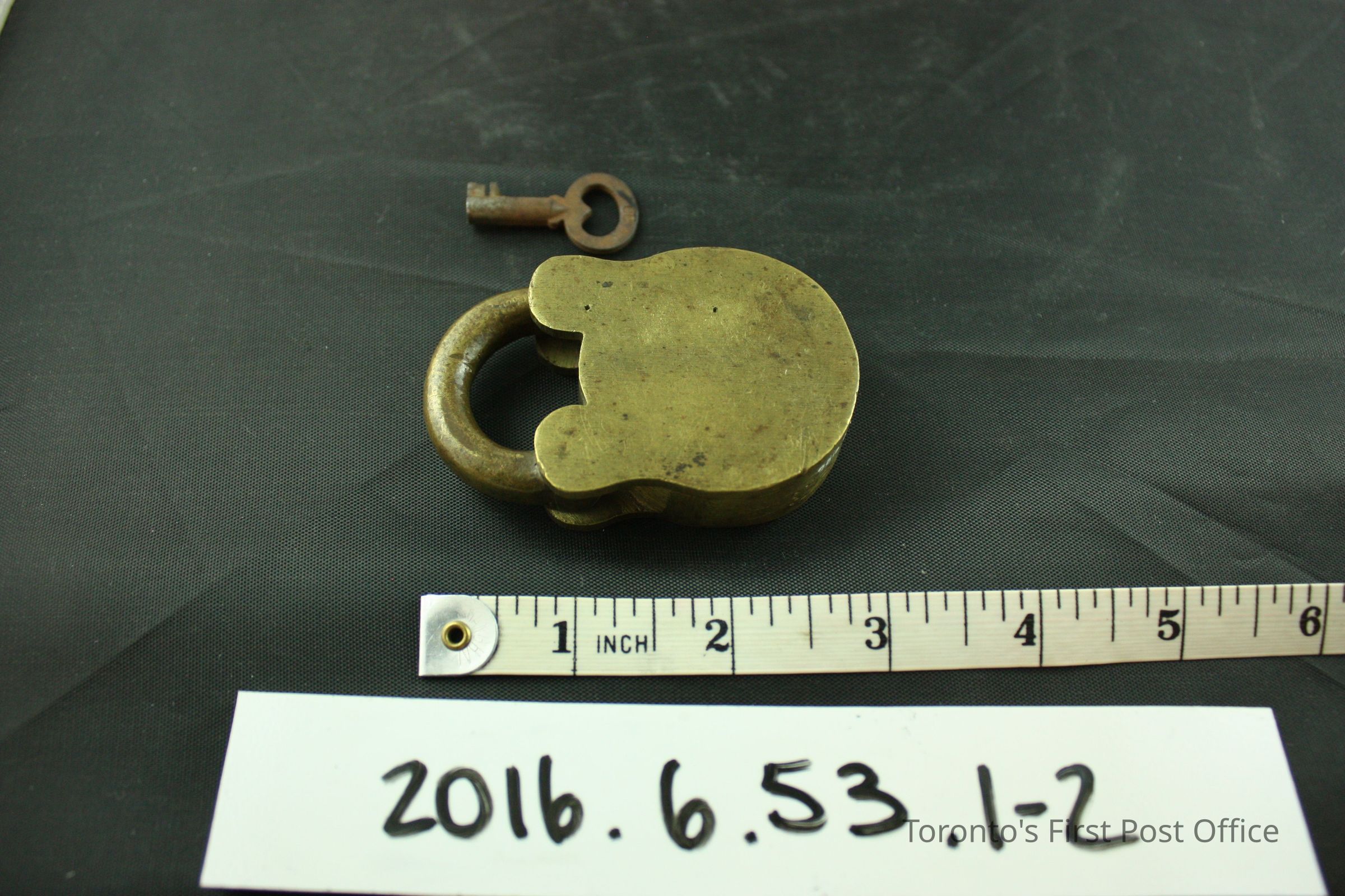 Brass handmade padlock, c. 1880 with key, no keyhole cover. In the center of the body, 'SECURE 4 LEVER' is stamped horizontally. The shackle swings away to proper right. The key has the letters 'CC' stamped at the top of the loop.Dimensions