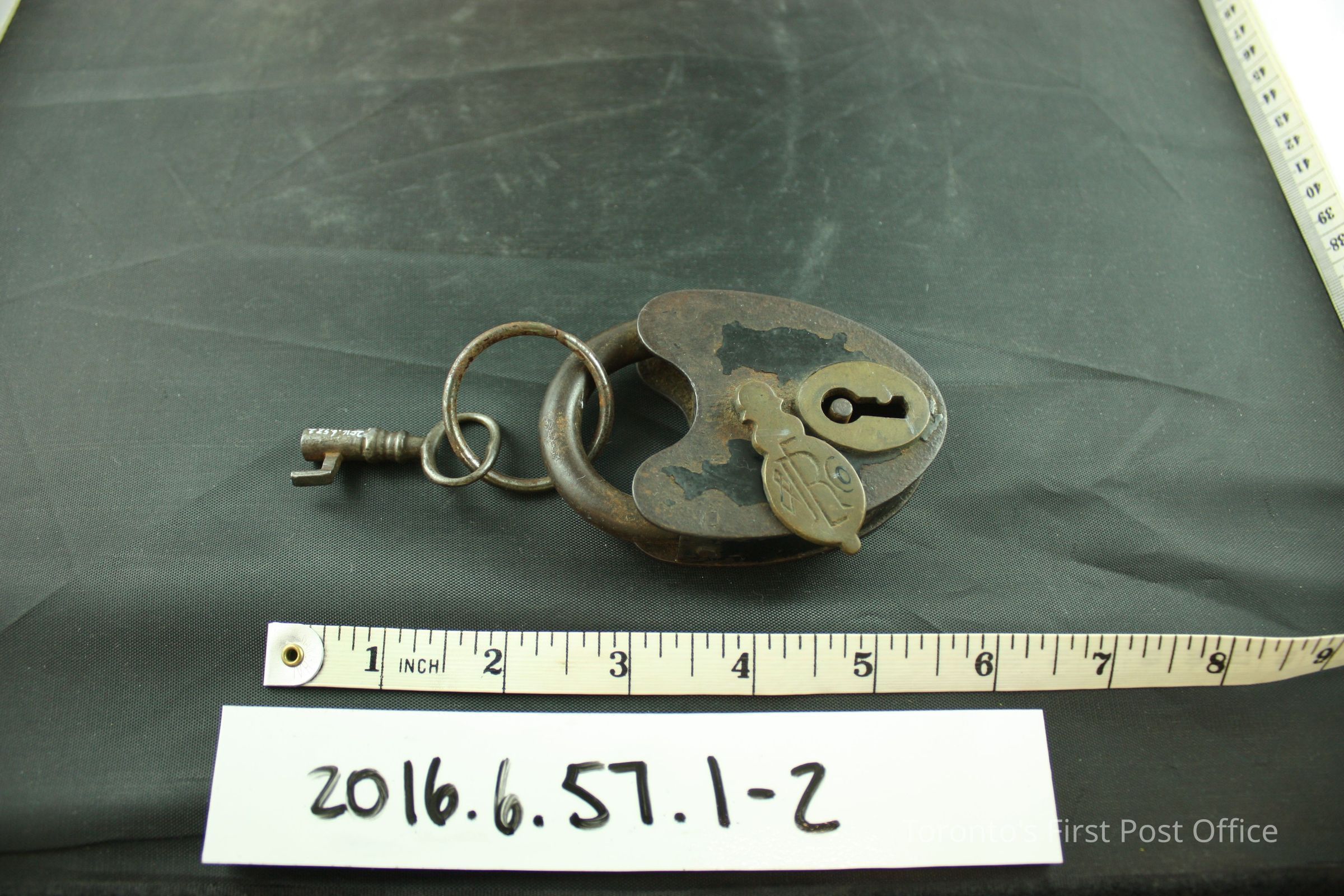 Iron handmade railway padlock with brass keyhole and keyhole cover, with key. 'E R & Co.' stamped on keyhole cover, probably denoting the Erie Railroad Company founded in 1861. The key appears to be original and is attached by its bow to a hoop which is then attached to the shackle. The shackle swings away to proper right, but the toe of the shackle is locked. Black paint flakes still visible on the body of the padlock.Dimensions
