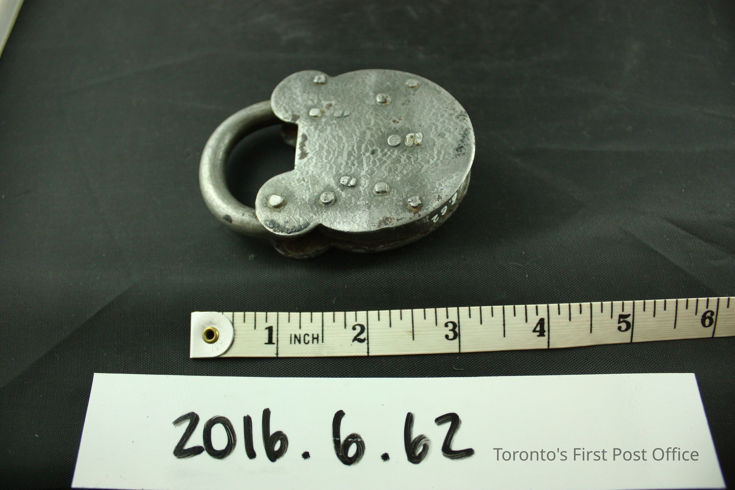 Steel handmade padlock, brass rectangular keyhole and keyhole cover, no key. The shackle swings away to proper right, but the toe of the shackle is partially stuck due to corrosion. The obverse of the padlock features five (5) crudely welded rivets, while the reverse features twelve (12). The sides of the body of the padlock bare three (3) rivets. the steel still has glossy sheen.Dimensions