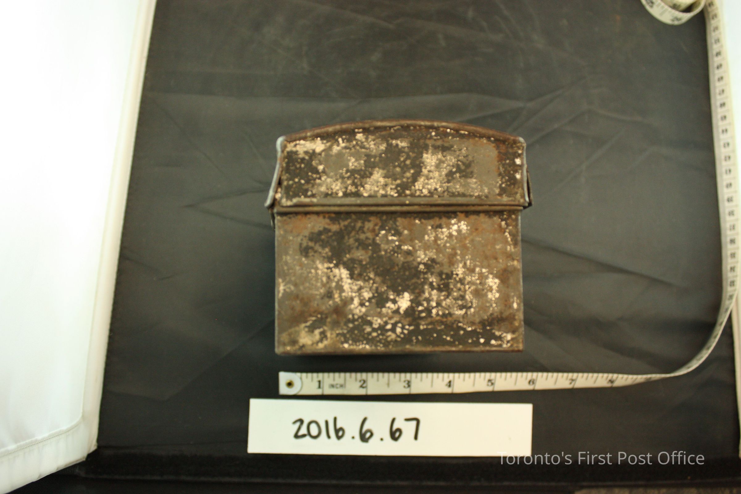 Domed tin (?) box with hinged lid. Lid swings away at 180° and is characterized by an additional metal band ornament in the middle. The rectangular latch catchs on a protruding metal hoop, is unlocked. A saudered lighter colour metal runs down the middle of the interior of the box, perhaps as a repair. Most likely painted entirely in black, paint pigments remain on the surface of the box.Dimensions