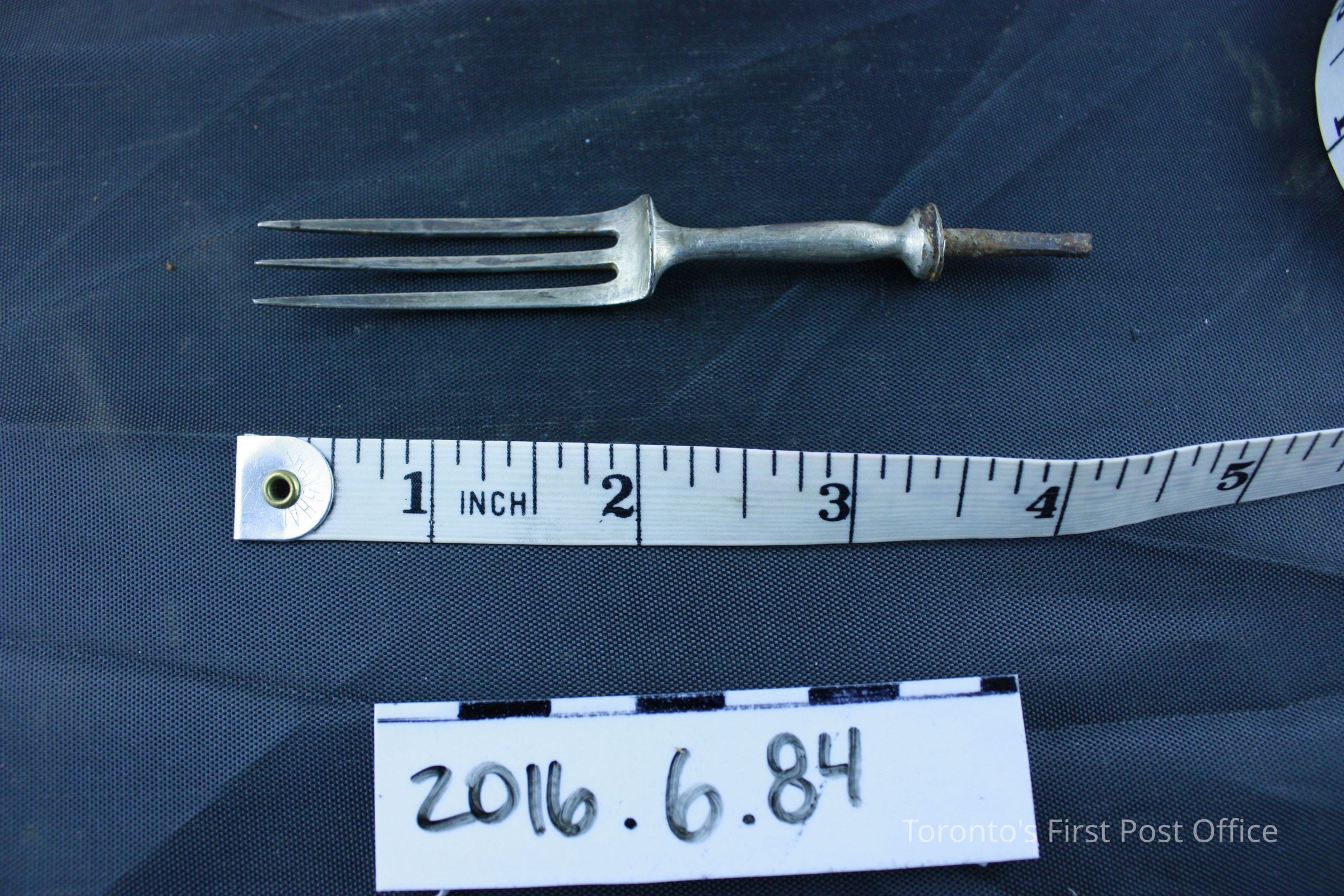 Nickel silver fork, missing handle. Three (3) tines form the head of the fork. Protruding from the base of the fork's neck is a metal spike, indicative of the missing handle.Dimensions