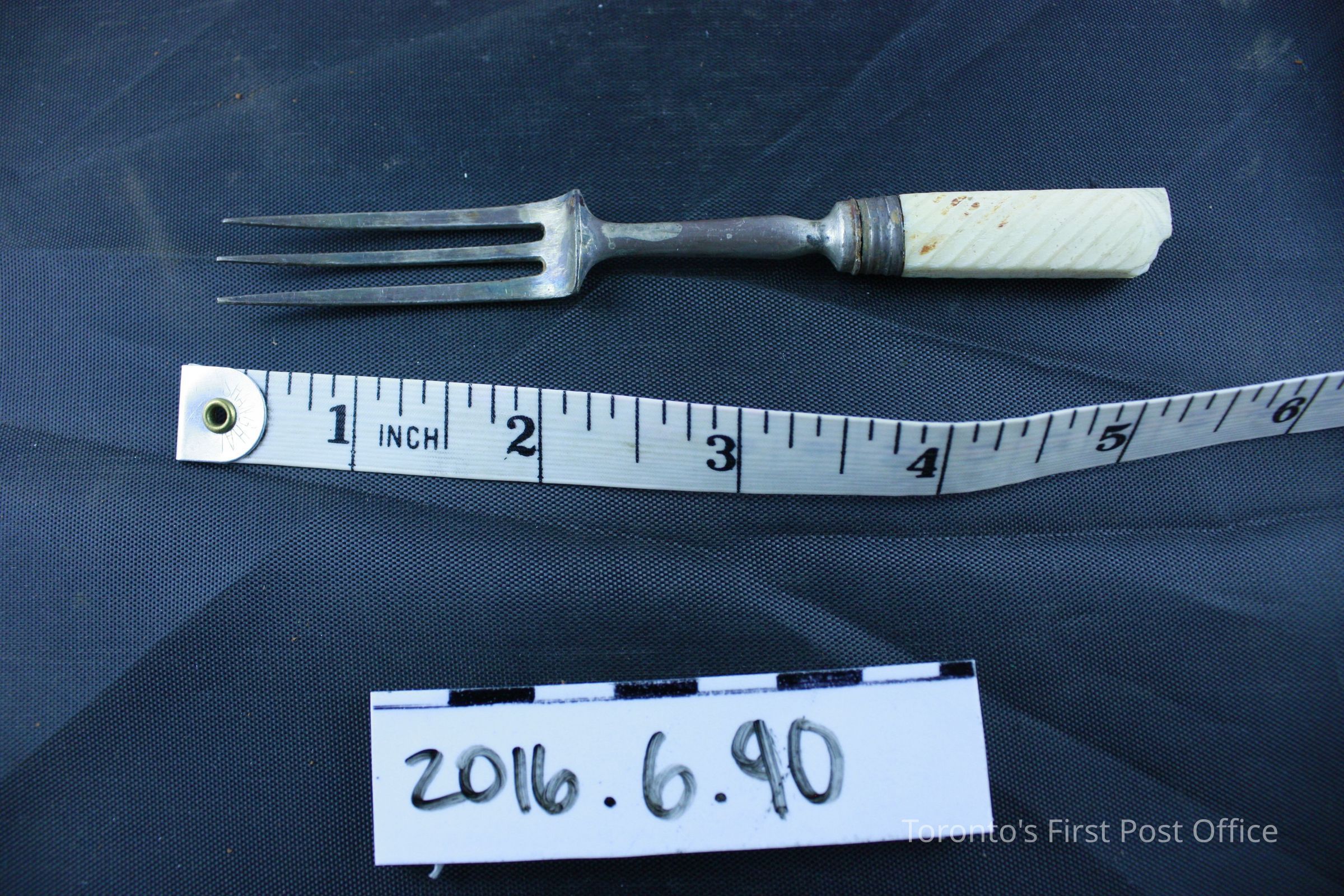 Nickel silver fork, missing part of ivory handle. Three (3) tines form the head of the fork. Attached to the neck of the fork by a darker nickel band is a portion of the original ivory handle. Where the handle has been cut or broken off, a wooden rod is in the center that would have kept the handle in place. The handle is marked by diagonal ridges as ornamentation.Dimensions